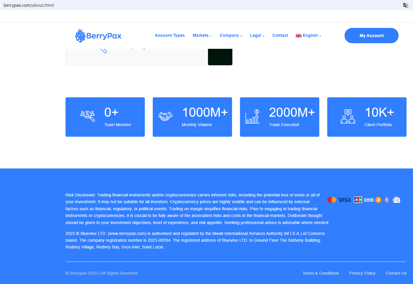 According to its website, it claims to be regulated by the Mwali International Services Authority (MISA) and registered in Saint Lucia. However, no matching information was found in MISA. As is well known, Saint Lucia does not have the authority to regulate foreign exchange. Furthermore, the Financial Services and Markets Authority (FSMA) issued a warning about BerryPAX for the lack of the required authorization.