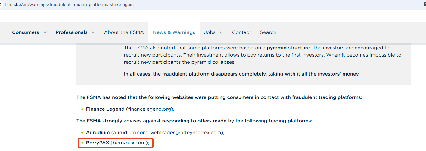 On Oct 14, 2025, the Financial Services and Markets Authority (FSMA) issued a warning about BerryPAX for the lack of the required authorization. https://www.fsma.be/en/warnings/fraudulent-trading-platforms-strike-again