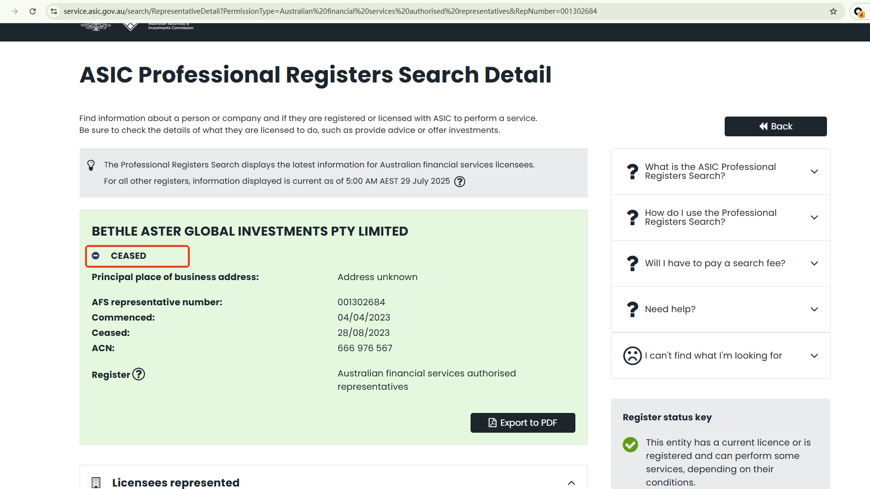 Upon investigation, we found that the licence issued to BethleAsterFX by the Australian Securities & Investments Commission(ASIC) appears to have been cancelled. We have been unable to obtain its licensing information. This suggests that the company may have ceased operating.