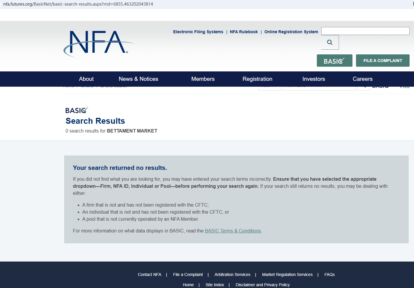 According to its website, it repeatedly emphasizes that it is subject to top global regulation, but it does not display a single piece of evidence of strong regulation on the website. It claims that its office is located in the United States, but after searching, no matching information was found in the National Futures Association (NFA). In addition, the Financial Conduct Authority (FCA) issued a warning regarding BETTAMENT MARKET, suspecting that this company may be offering financial services or products without the necessary authorization.