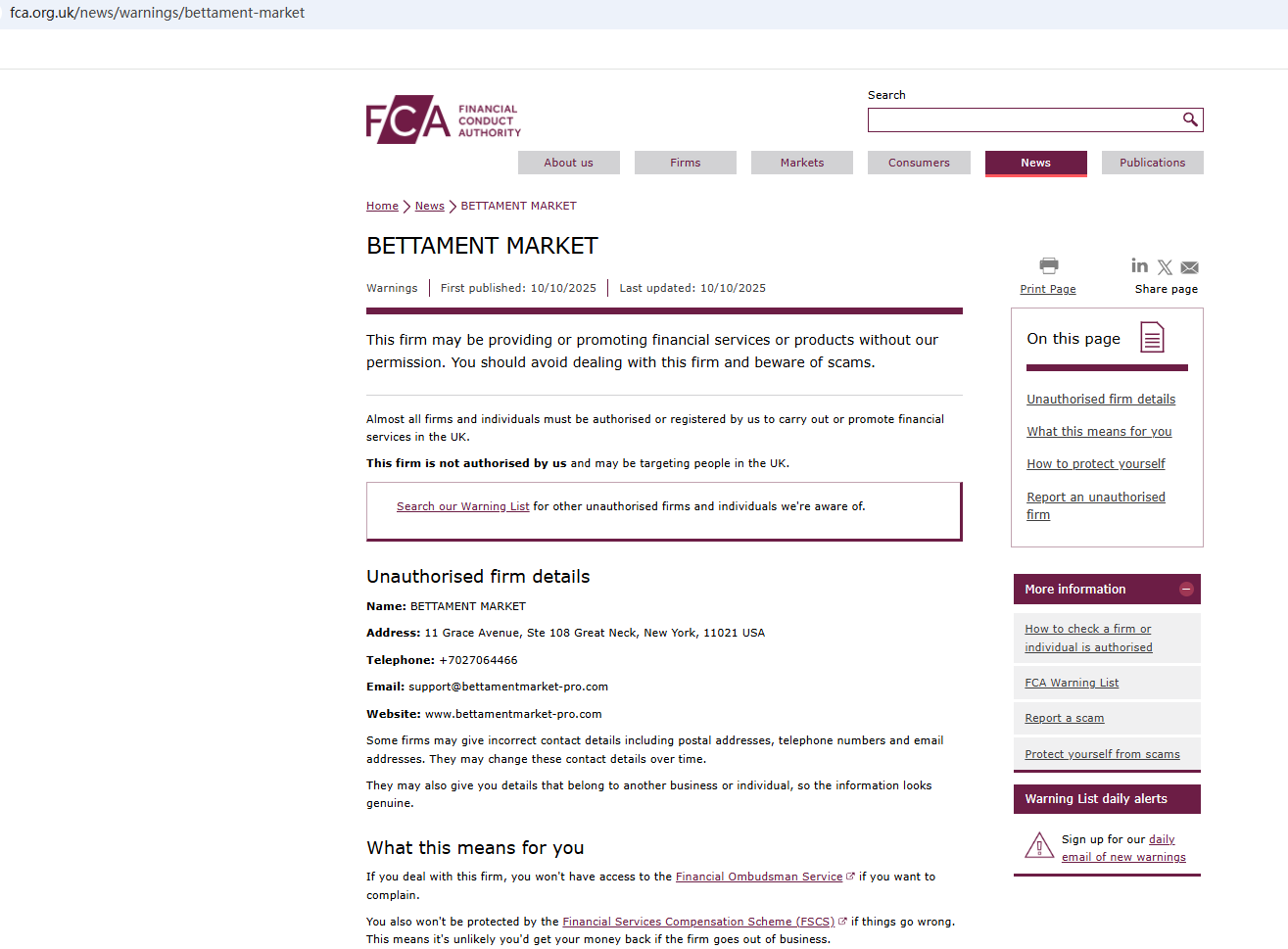 On Oct 10, 2025, the Financial Conduct Authority (FCA) issued a warning regarding BETTAMENT MARKET, suspecting that this company may be offering financial services or products without the necessary authorization. https://www.fca.org.uk/news/warnings/bettament-market