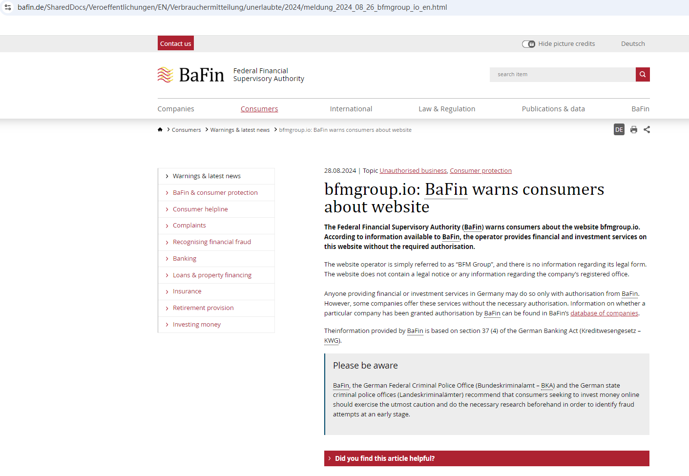 On August 28, 2024, the Federal Financial Supervisory Authority (BaFin) warned consumers about the website bfmgroup.io, stating that the financial and investment services are being provided on this website without the required authorization. https://www.bafin.de/SharedDocs/Veroeffentlichungen/EN/Verbrauchermitteilung/unerlaubte/2024/meldung_2024_08_26_bfmgroup_io_en.html