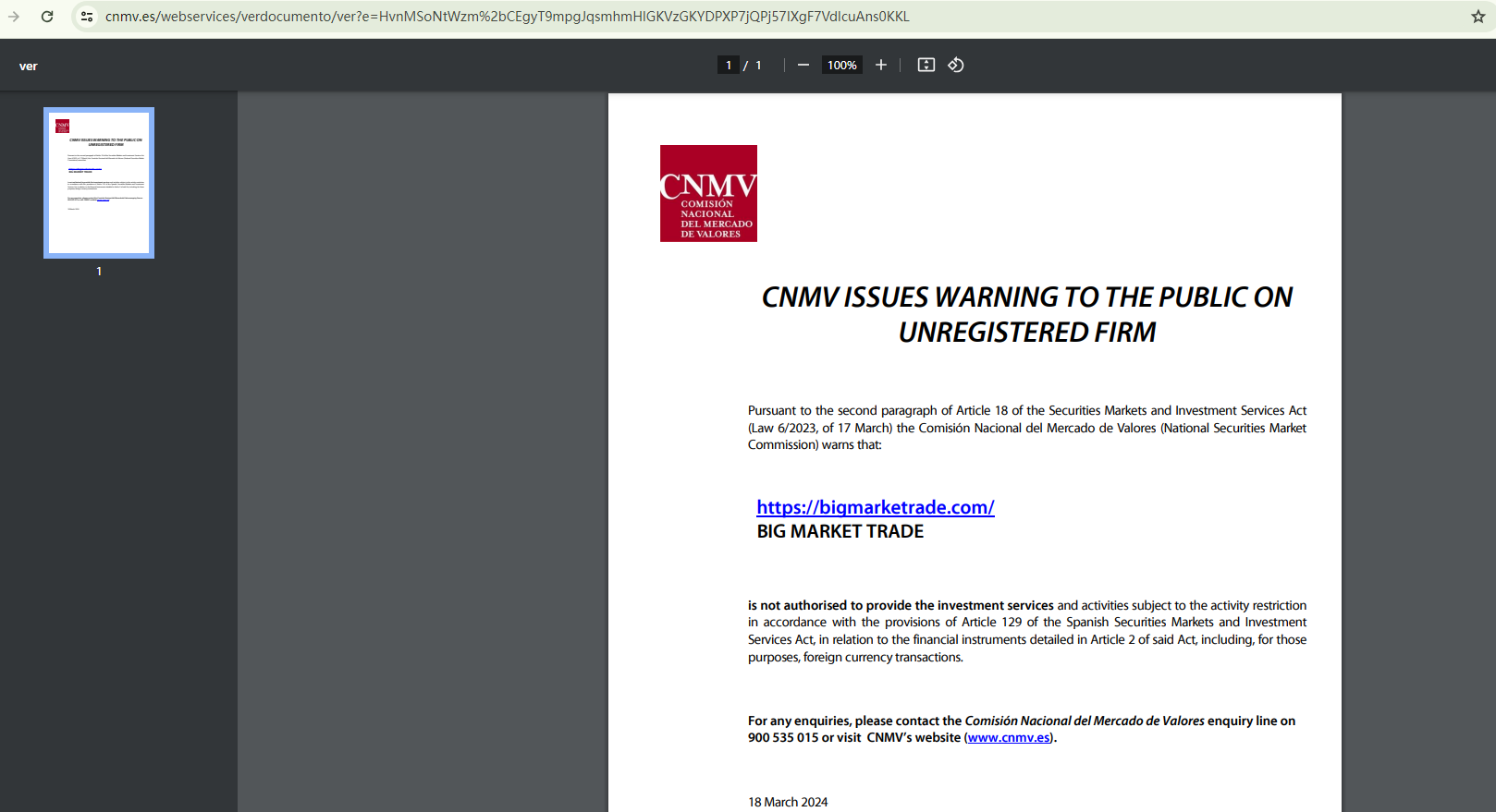 In addition, the Comisión Nacional del Mercado de Valores (CNMV) has added Big Market Trade to its warning list for providing investment services without authorization.