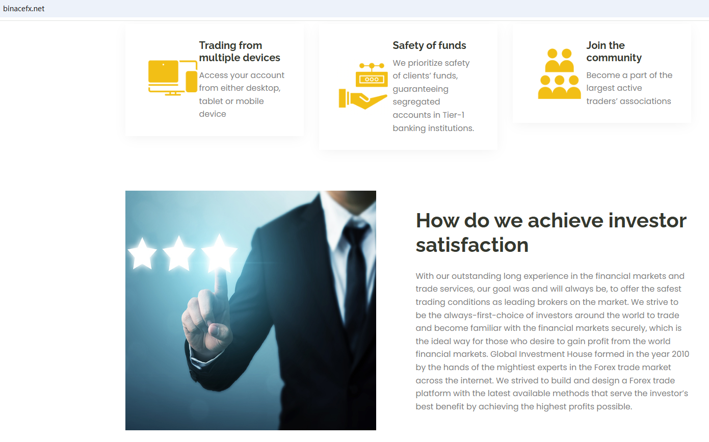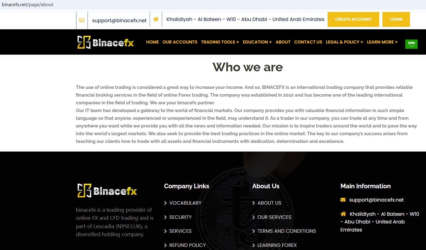 Binacefx claims to be an international trading company located in the United Arab Emirates, providing financial broking services in the field of online Forex and CFD trading. But there is no detailed financial services licenses and other licensing certificates. A company that offers financial services must have financial license in the country where it is located.
