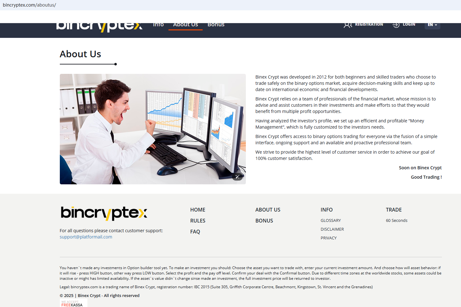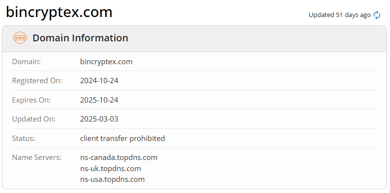 In essence, BinCryptex(aka BinCrypt24) is not regulated by any governing body. Entrusting it with investors' funds is highly risky, as there are no legal protections in place to safeguard the funds. BinCryptex(aka BinCrypt24) appears to be a scam.