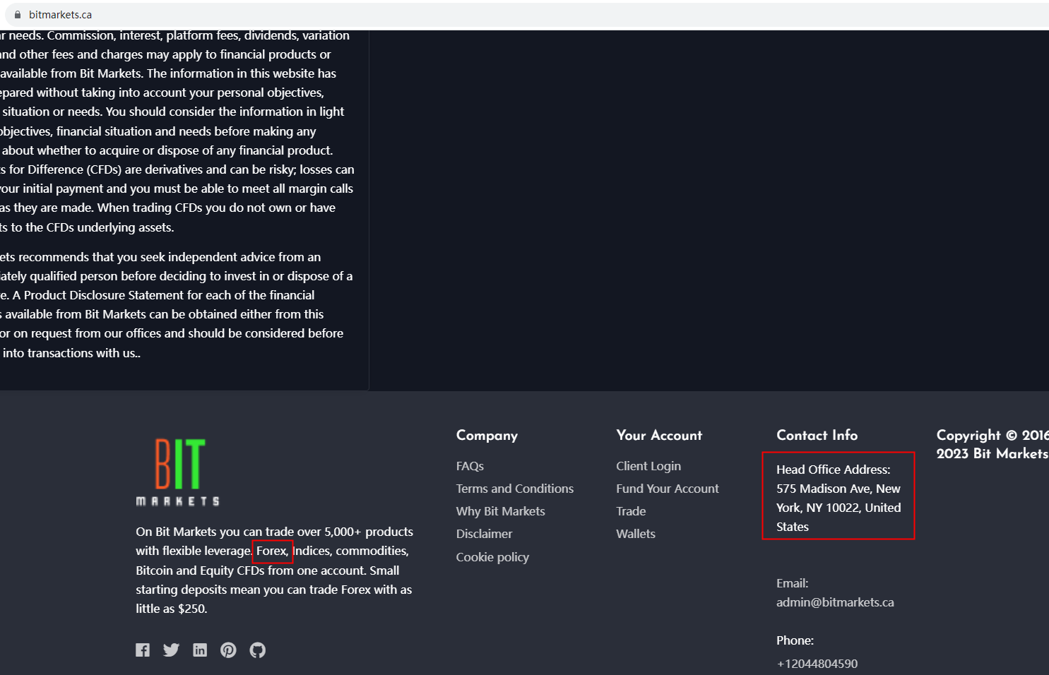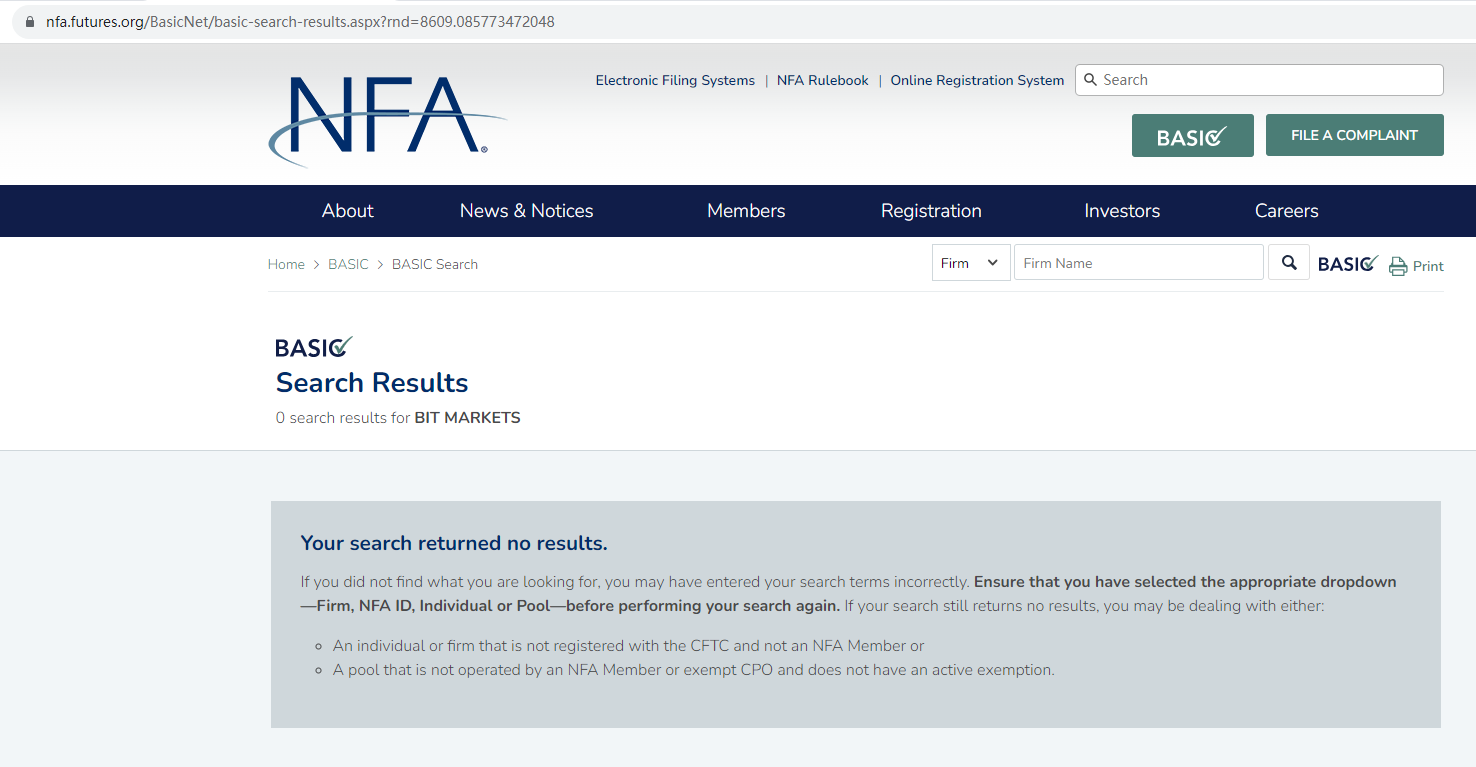 There is no any regulatory information on its website. This broker locates in USA, but we don't find the correct information on National Futures Association (NFA) matching to Bit Markets. The truth is that Bit Markets is not under valid regulation by any regulators to do forex. Investors' funds in this broker are unsafe and cannot be protected by any law.