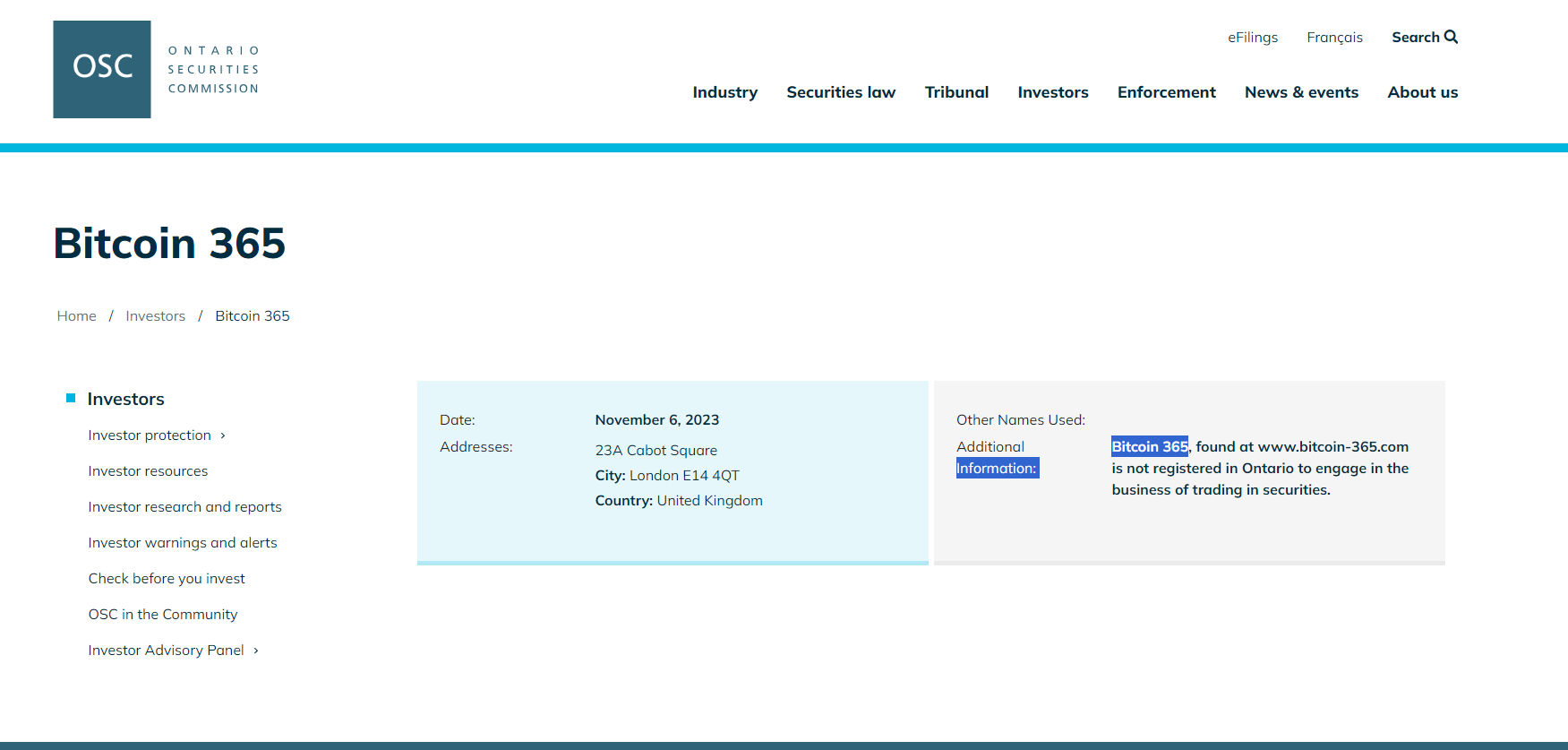 On 6 November 2023, the Ontario Securities Commission (OSC) issued a warning that Bitcoin 365 was providing financial services or products without authorisation. You may visit: https://www.osc.ca/en/investors/warnings/bitcoin-365
