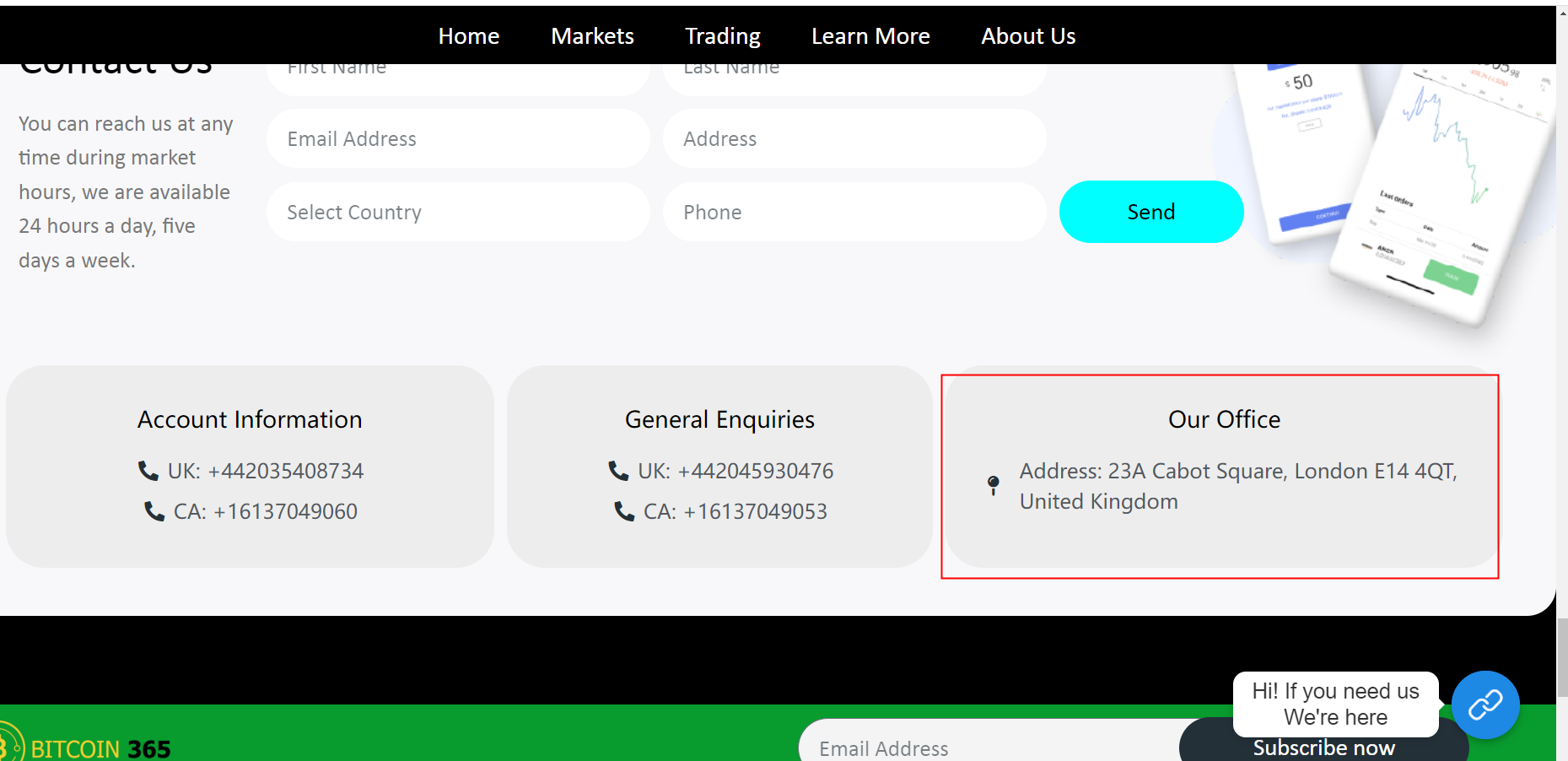 According to its website, Bitcoin 365 claims to be a reliable company and it located in the UK and Canada. However, upon investigation, there is no matching information was found in the Financial Conduct Authority (FCA), Investment Industry Regulatory Organization of Canada (IIROC). Otherwise, it registered with Financial Transactions and Reports Analysis Centre of Canada (FINTRAC), we didn't find any matching information in the FINTRAC, and FINTRAC is an agency that regulates money laundering and does not have regulatory authority over foreign exchange.