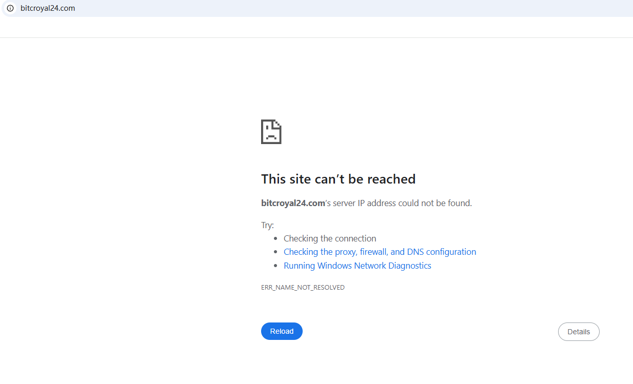 BrokersView found that the domain "https://bitcroyal24.com/" is currently inaccessible. This is widely regarded as a significant red flag, as the suspension of a broker's website often points to underlying regulatory or operational issues.