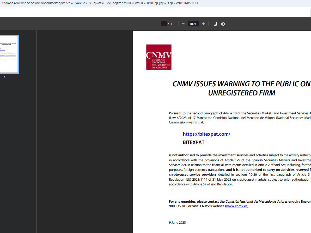 On June 9, 2025, the National Securities Market Commission (CNMV) issued a warning against BitExpat, believing this company might be providing financial services or products without proper authorization. https://www.cnmv.es/webservices/verdocumento/ver?e=ETcz7y5kevTZSix4R9t5%2bpqsmhmHlGKVzGKYDPXP7jQPj57IXgF7VdIcuAns0KKL