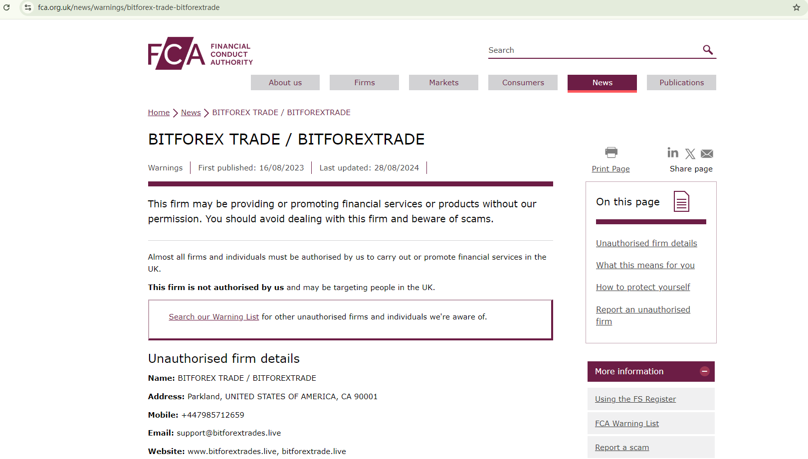 Secondly, its website showcases a certificate from the Companies House (CH) to appear legitimate. However, the CH only serves as a registrar of companies in the UK and has no authority to issue financial licenses. Mere registration with the CH doesn't mean the authorization for financial business. More importantly, the UK financial watchdog, the Financial Conduct Authority (FCA) has issued a warning against BITFOREX TRADE, warning the public about this unauthorized firm.