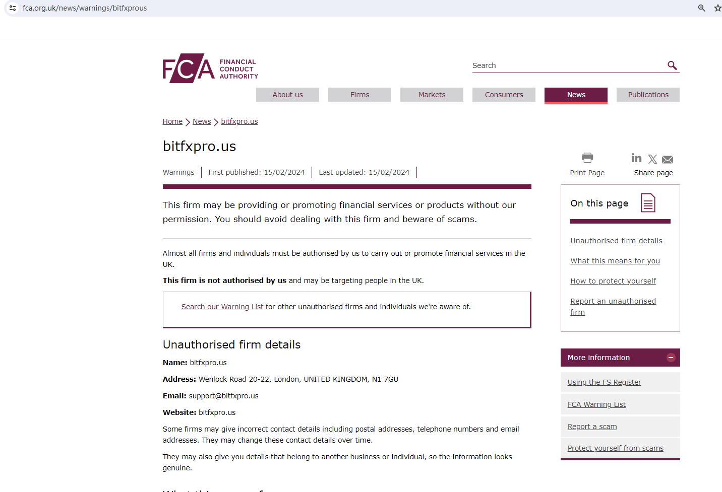 On 15 February 2024, the United Kingdom Financial Conduct Authority (UK FCA) issued a warning that bitfxpro.us was providing financial services or products in the UK without authorisation. You may visit: https://www.fca.org.uk/news/warnings/bitfxprous