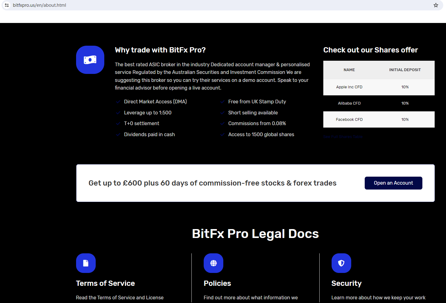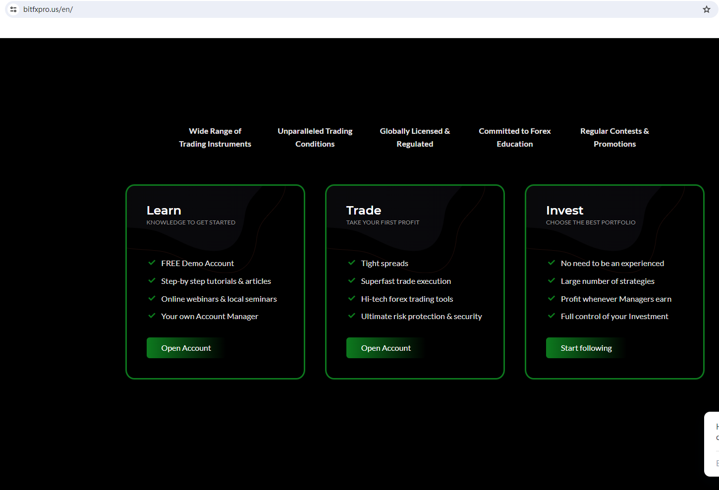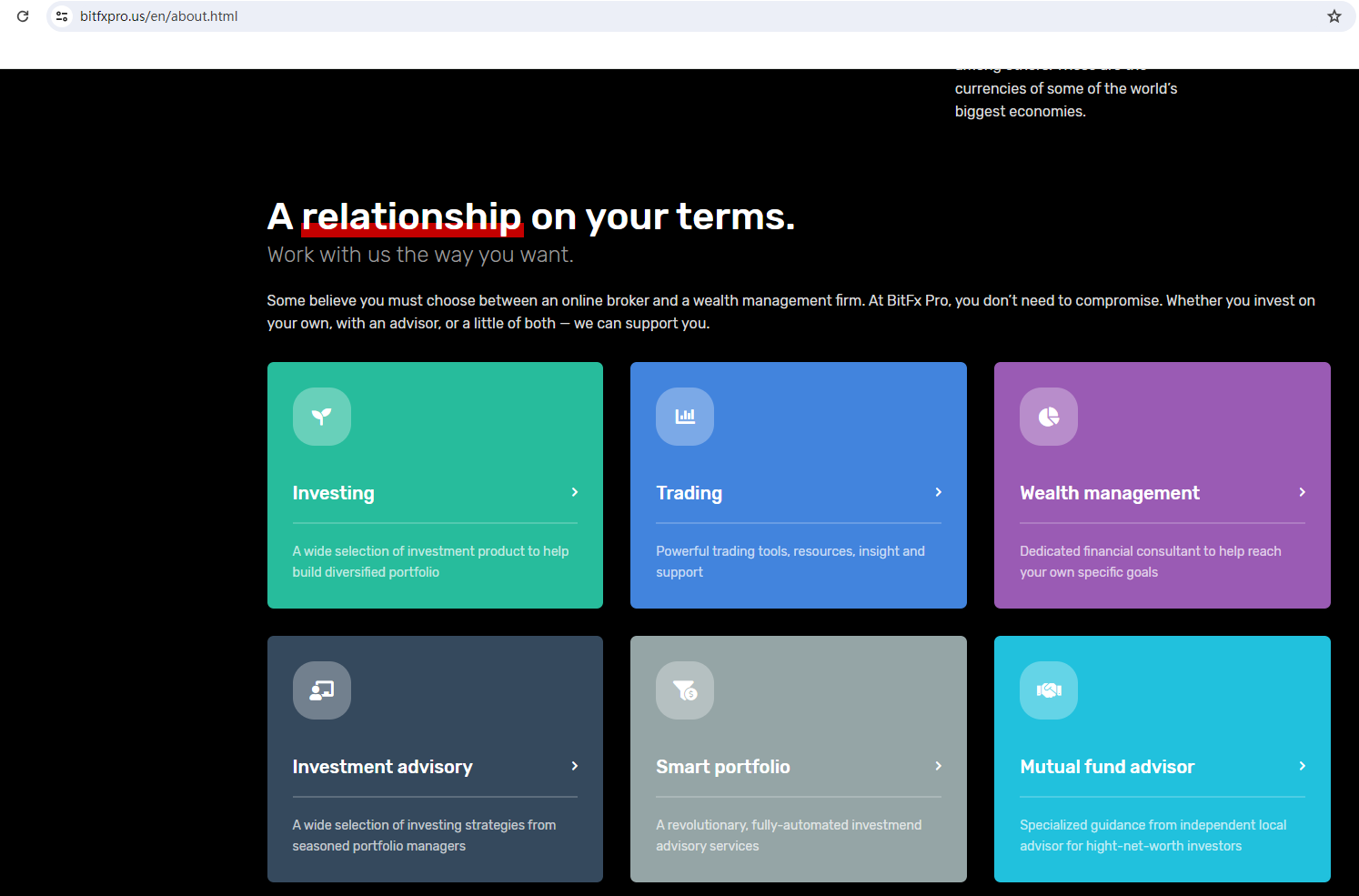 According to its website, we can find that this scam website uses a website template commonly used by fake traders. This template comes with fixed content and icon design. Scam websites often exhibit certain common traits. They typically have short lifespans, disappearing as soon as their fraudulent activities are discovered, only to reappear under a different brand and web address. These sites are frequently hastily assembled, with fraudsters commonly utilizing basic forex broker website templates to facilitate their scams. They simply replace the existing brand name in the content with their own, often neglecting to ensure grammatical accuracy or logical consistency. bitfxpro.us is a prime example of such group scammers. It utilizes the same website template as REAL INVESTMENT LTD (https://www.brokersview.com/brokers/real-investment-ltd), a scam previously exposed by BrokersView.