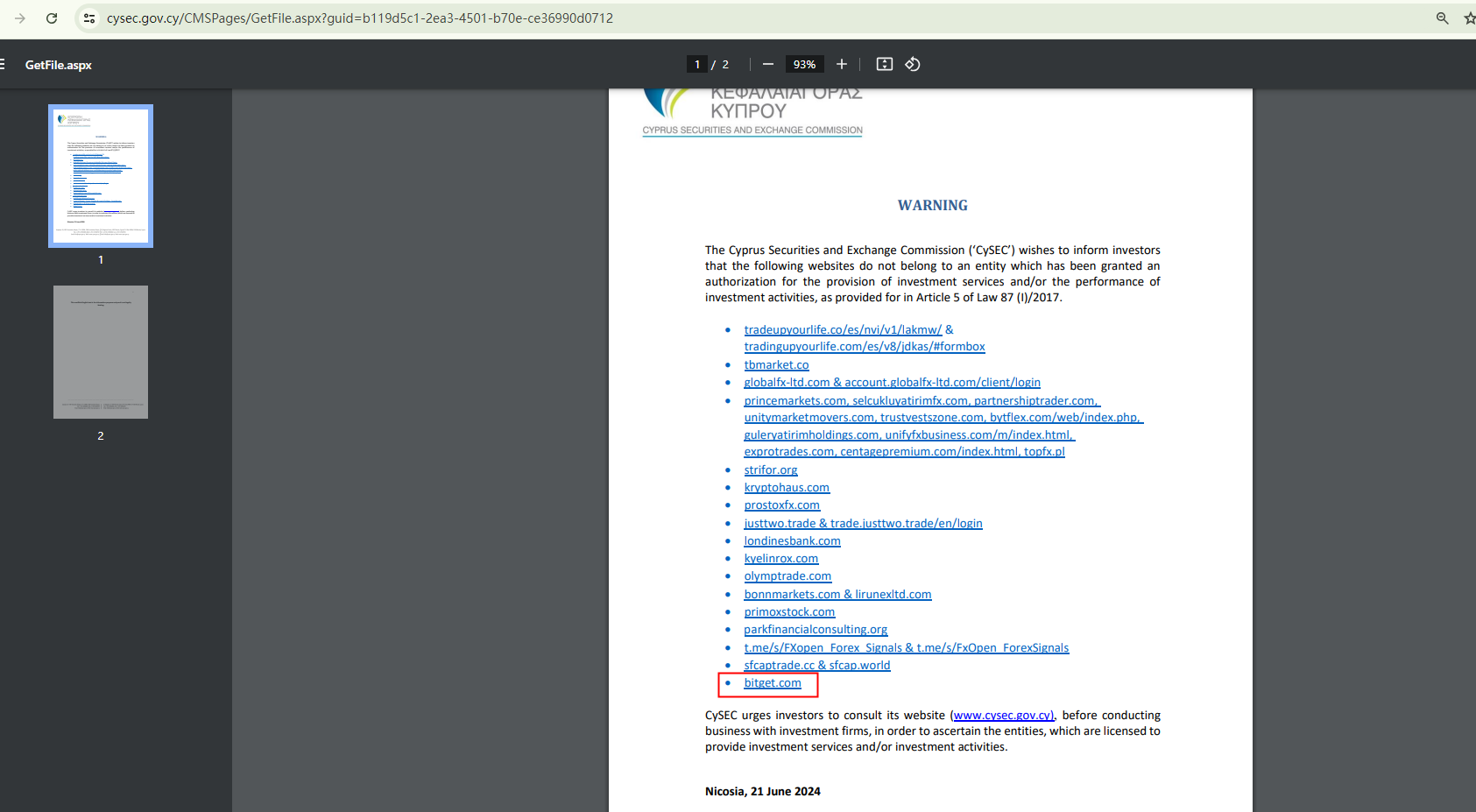 On June 21, 2024, the Cyprus Securities and Exchange Commission (CySEC) added Bitget to its warning list, stating it does not belong to an entity which has been granted an authorization for the provision of investment services and/or the performance of investment activities. https://www.cysec.gov.cy/CMSPages/GetFile.aspx?guid=b119d5c1-2ea3-4501-b70e-ce36990d0712
