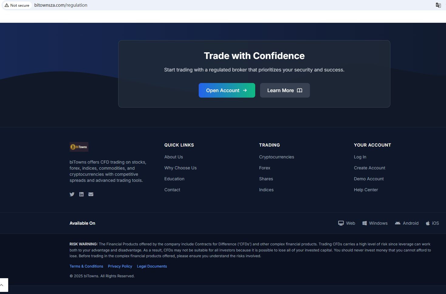 According to its website, it claims to be regulated by the Seychelles Financial Services Authority (Seychelles FSA) and the Cyprus Securities and Exchange Commission (CySEC). Upon investigation, no matching information was found in the Seychelles FSA and CySEC. In addition, the Financial Conduct Authority (FCA) issued a warning regarding BITOWNS, suspecting that this company may be offering financial services or products without the necessary authorization.