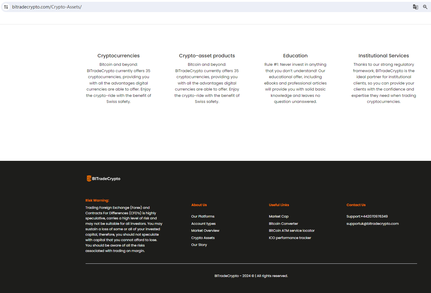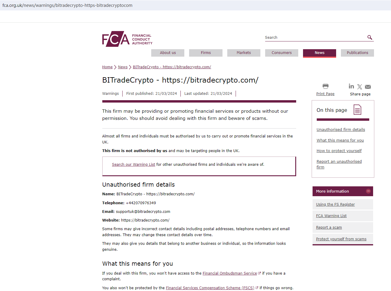 On 21 March 2024, the United Kingdom Financial Conduct Authority (UK FCA) issued a warning that BITradeCrypto was providing financial services or products in the UK without authorisation. You may visit: https://www.fca.org.uk/news/warnings/bitradecrypto-https-bitradecryptocom