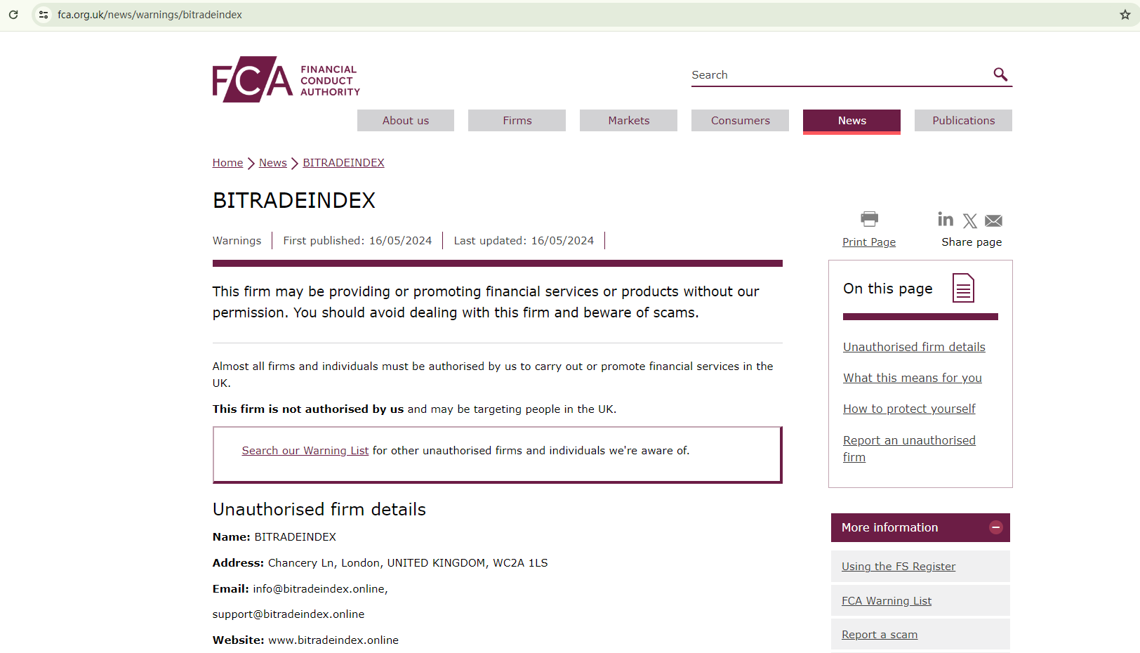 On May 16, 2024, the Financial Conduct Authority (FCA) issued a warning against BITRADEINDEX, believing this company might be providing financial services or products without proper authorization in the UK. https://www.fca.org.uk/news/warnings/bitradeindex