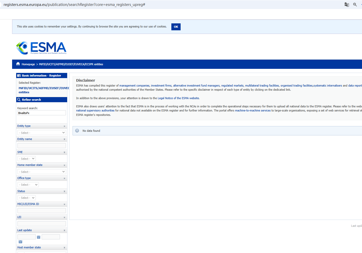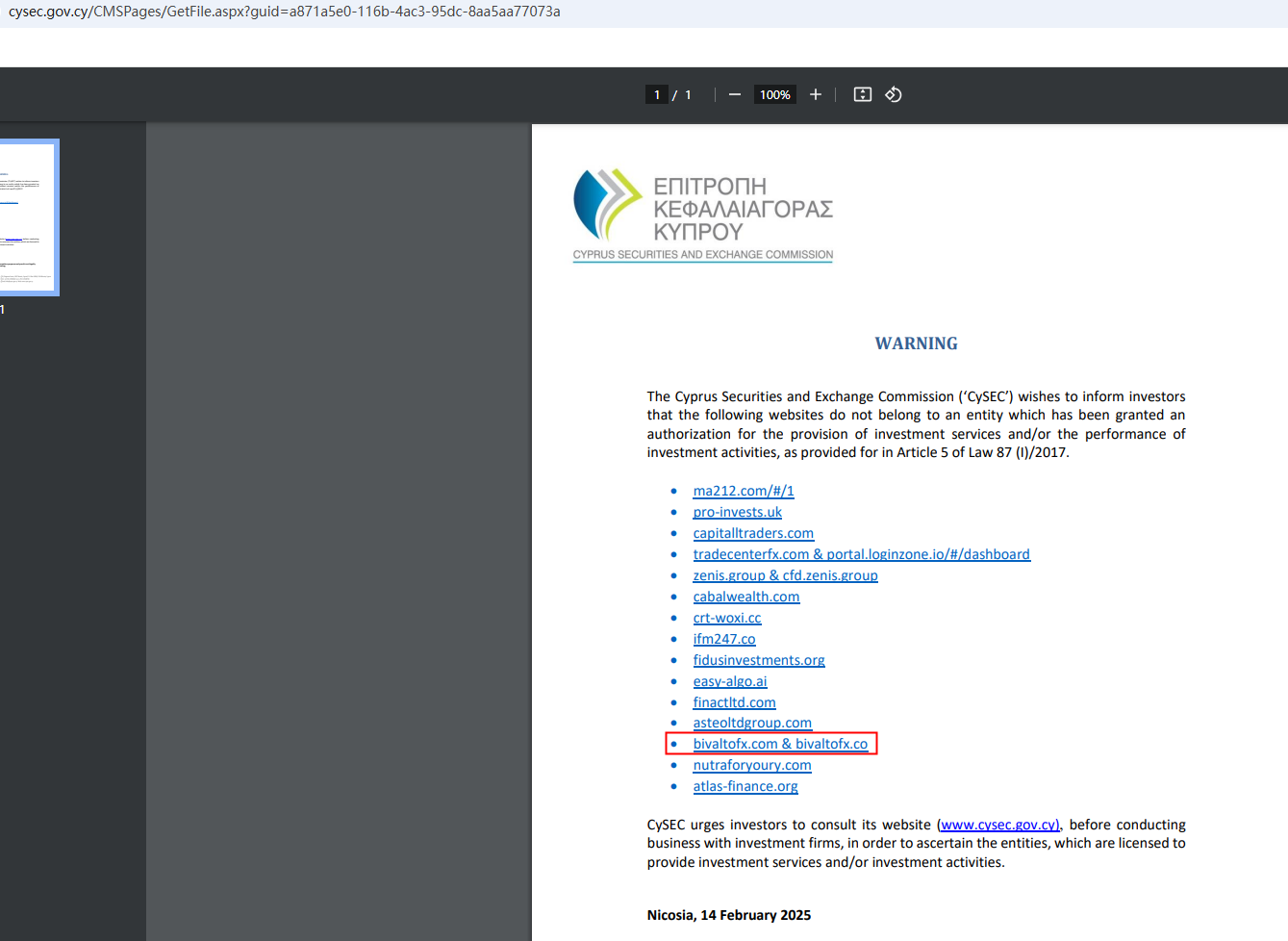 On 14 February 2025, the Cyprus Securities and Exchange Commission (CySEC) warned consumers about the services offered by the company BivaltoFx, which is offering financial and investment services without the required authorization. https://www.cysec.gov.cy/CMSPages/GetFile.aspx?guid=a871a5e0-116b-4ac3-95dc-8aa5aa77073a