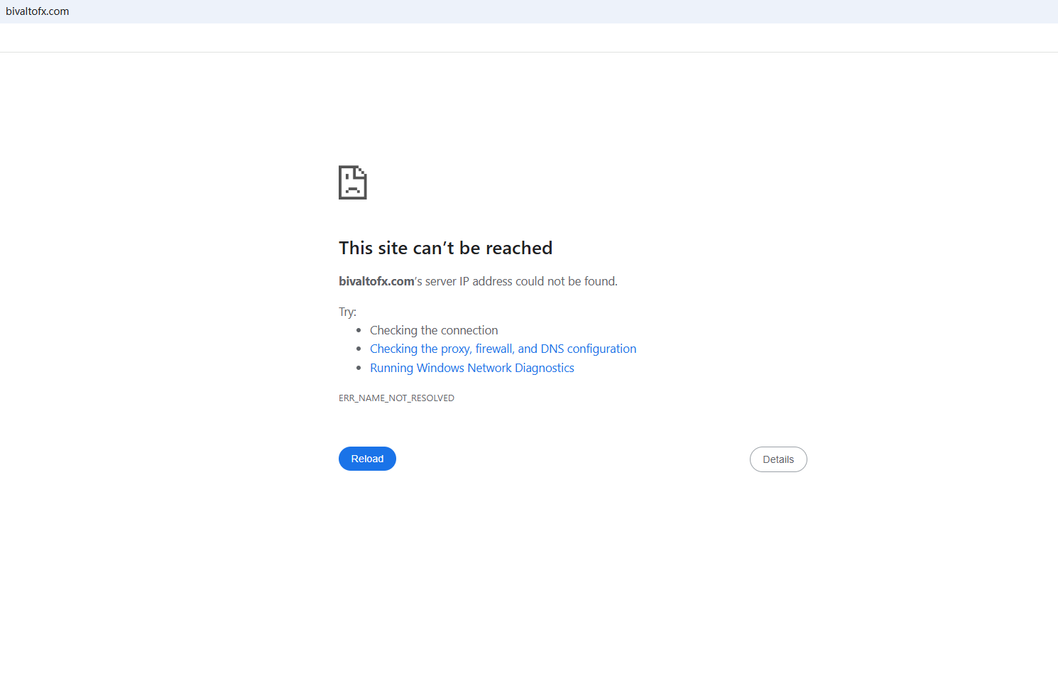 BrokersView found that the domain "bivaltofx.com" is currently inaccessible. This is widely regarded as a significant red flag, as the suspension of a broker's website often points to underlying regulatory or operational issues.