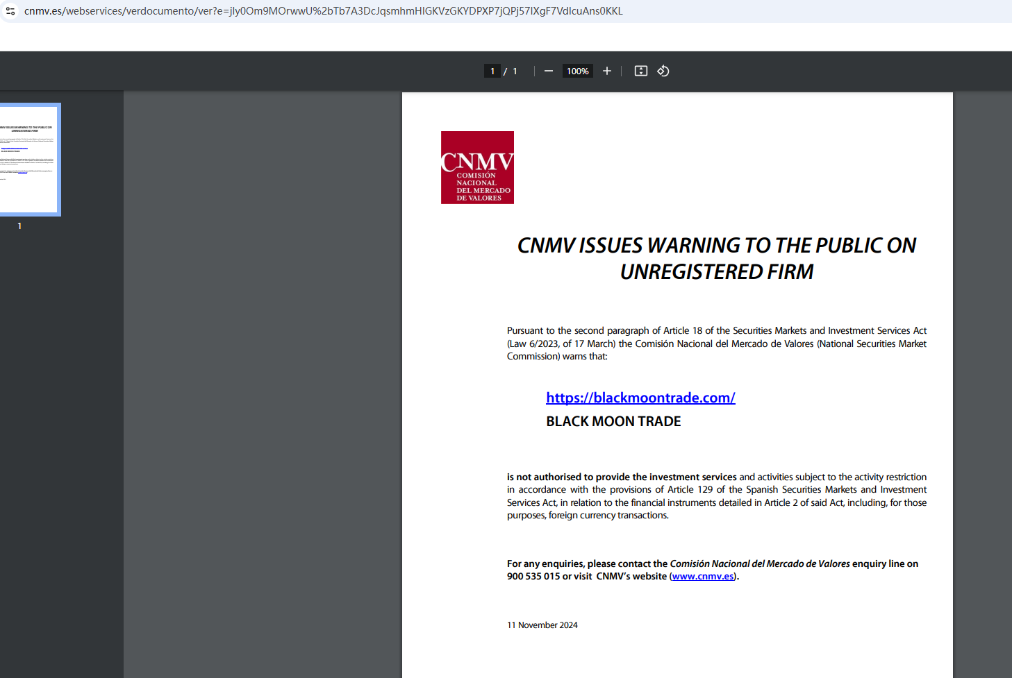 On November 11, 2024, the Comisión Nacional del Mercado de Valores (CNMV) has added BLACK MOON TRADE to its warning list for providing investment services without authorization. https://www.cnmv.es/webservices/verdocumento/ver?e=jly0Om9MOrwwU%2bTb7A3DcJqsmhmHlGKVzGKYDPXP7jQPj57IXgF7VdIcuAns0KKL