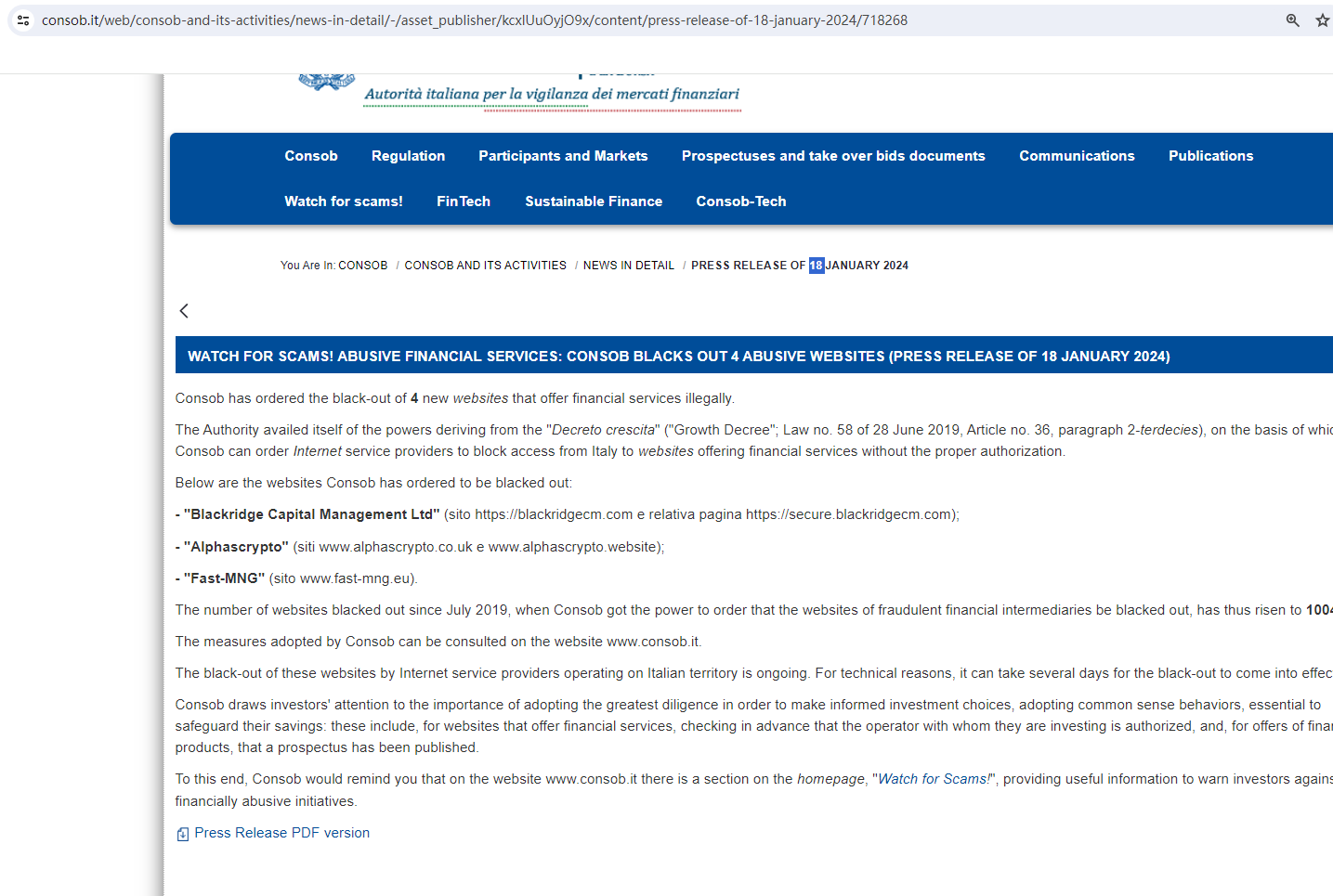 In addition, the Commissione Nazionale per le Società e la Borsa (CONSOB) issued a warning that Blackridge Capital Management Ltd was providing financial services or products without authorisation.