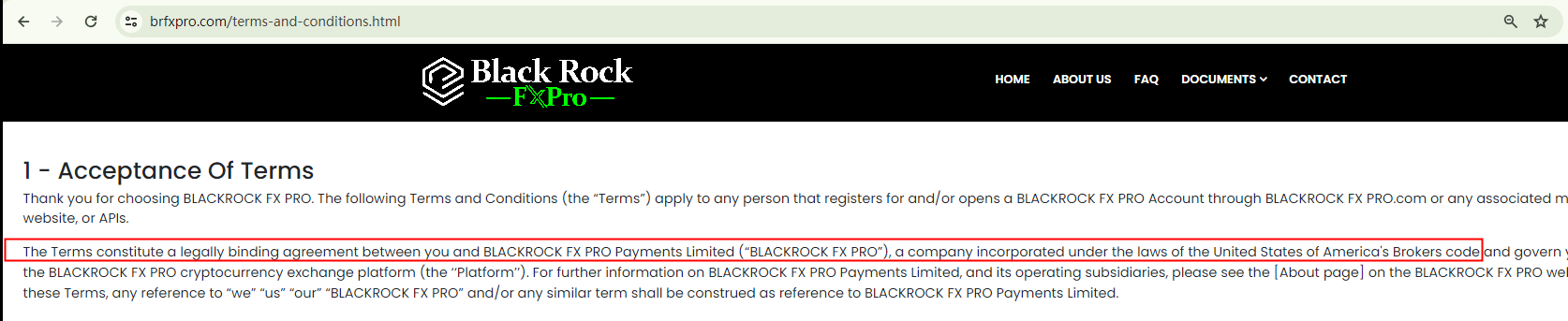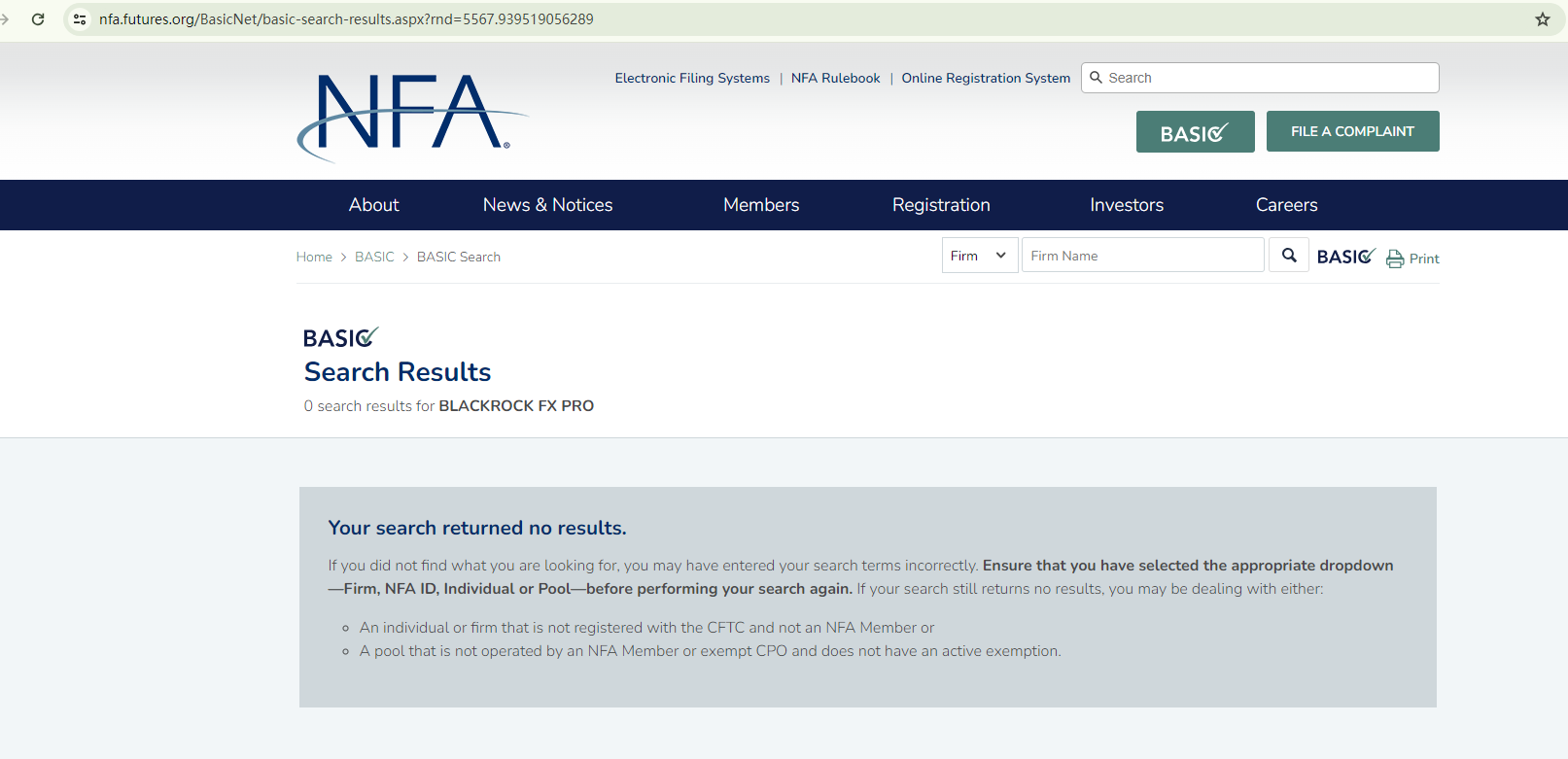 BLACKROCK FX PRO purports to be established under US law, but there are no corresponding records in the National Futures Association (NFA) register to support its legitimacy. Furthermore, despite listing a UK address as its office, the Financial Conduct Authority (FCA) has issued a warning against BLACKROCK FX PRO, identifying it as an unauthorized firm in the UK.