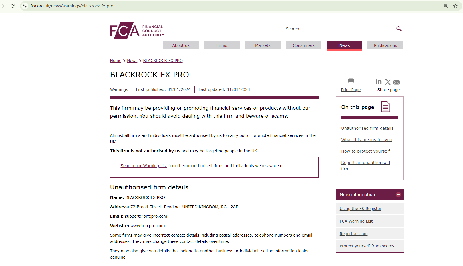 On January 31, 2024, the Financial Conduct Authority (FCA) issued a warning against BLACKROCK FX PRO, believing this company might be providing financial services or products without proper authorization in the UK. https://www.fca.org.uk/news/warnings/blackrock-fx-pro