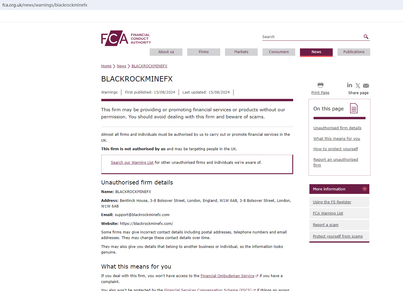 On August 15 2024, the Financial Conduct Authority (FCA) issued a warning against BLACKROCKMINEFX believing this company might be providing financial services or products without proper authorization in the UK. https://www.fca.org.uk/news/warnings/blackrockminefx