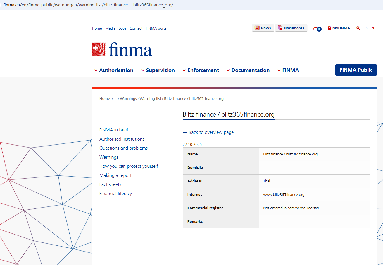 On Oct 27, 2025, the Swiss Financial Market Supervisory Authority (FINMA) issued a warning against Blitz finance, stating that this broker is not entered in its commercial register. https://www.finma.ch/en/finma-public/warnungen/warning-list/blitz-finance---blitz365finance_org/
