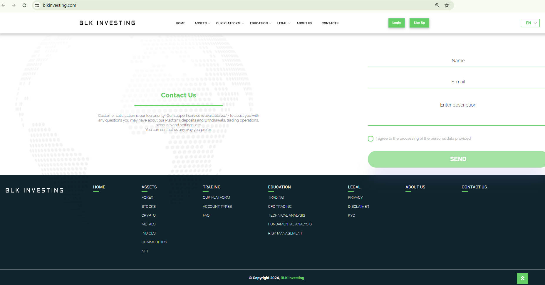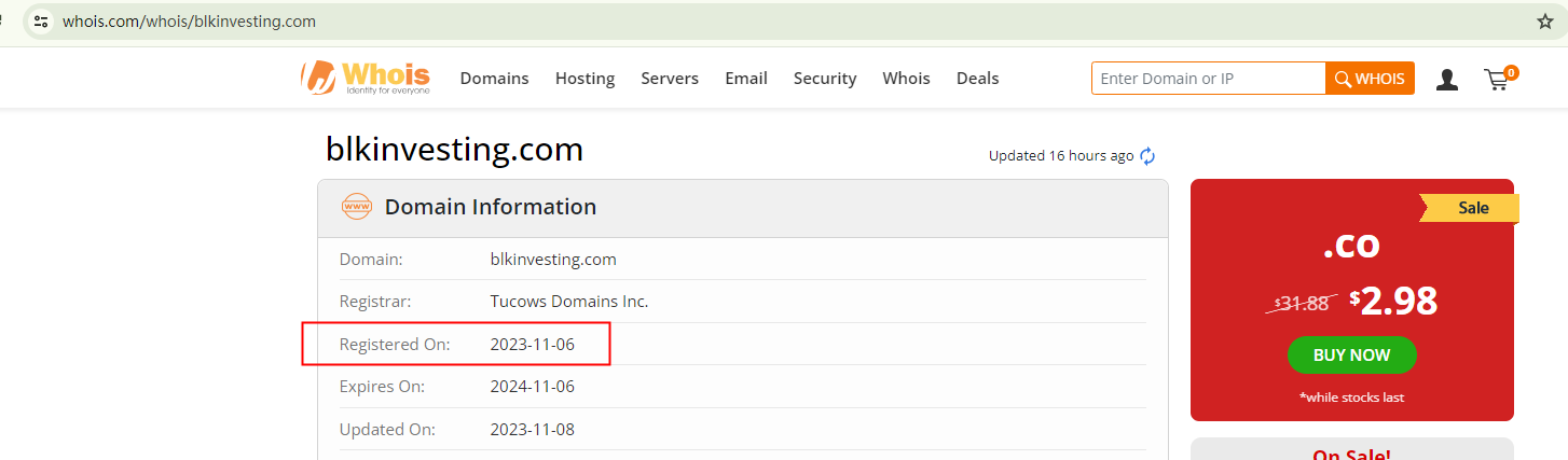 Despite the claim of being in business for over 9 years, its domain name, blkinvesting.com, was first registered in November 2023. The situation where a newly emerged website pretending to have years of experience casts doubts on its authenticity and legitimacy.