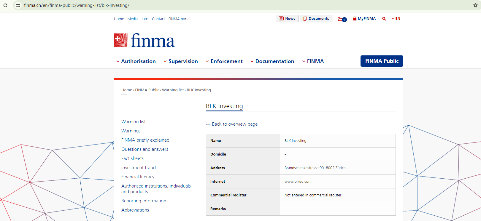 On March 27, 2024, the Swiss Financial Market Supervisory Authority (FINMA) issued a warning against BLK Investing, stating that this broker is not entered in its commercial register. https://www.finma.ch/en/finma-public/warning-list/blk-investing/