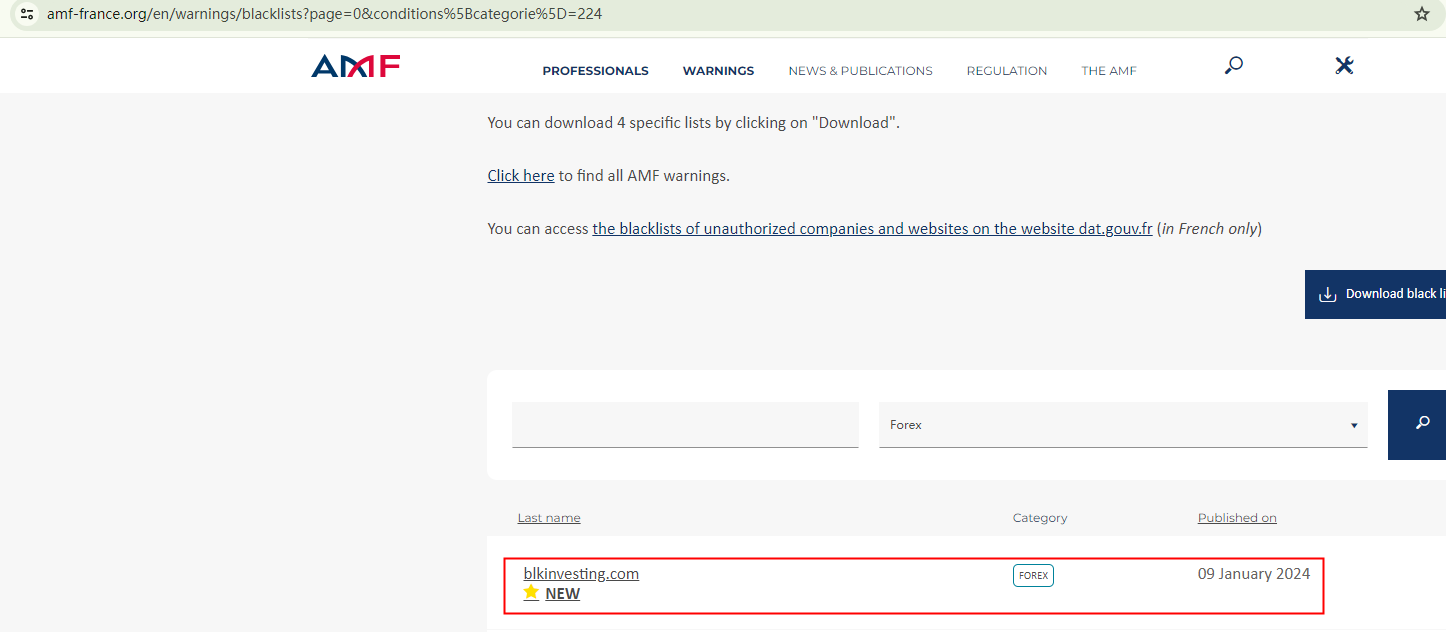 On January 9, 2024, the Financial Authority (Autorité des Marchés Financiers, AMF) added BLK Investing to warning list for it being an unauthorized company engaging in forex activities. https://www.amf-france.org/en/warnings/blacklists?page=0&conditions%5Bcategorie%5D=224