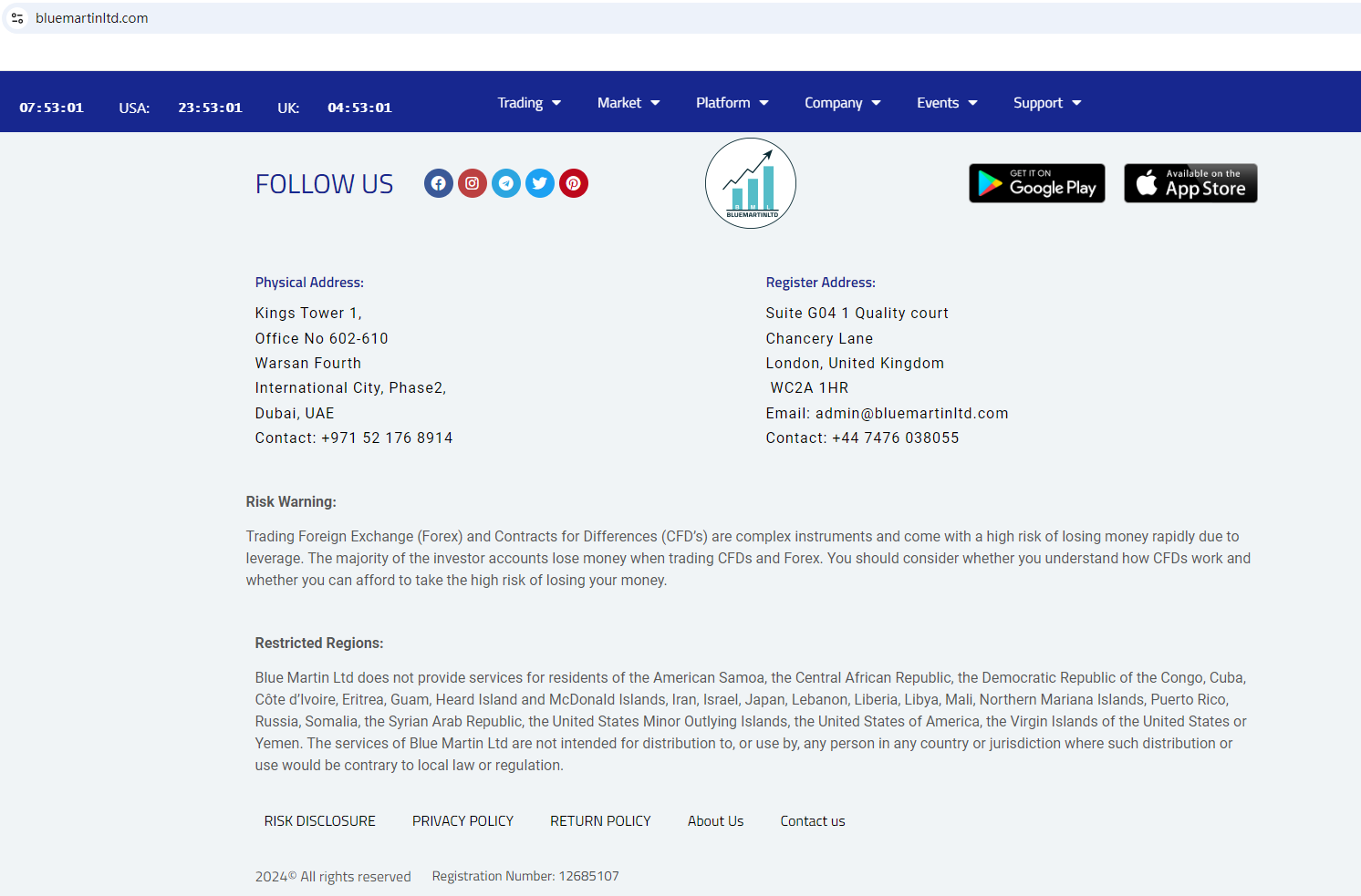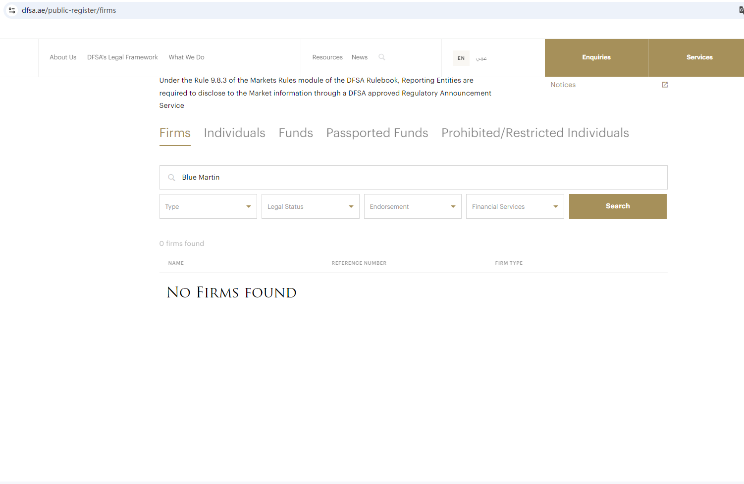 The truth is that Blue Martin Ltd is not regulated by any regulators. Letting it hold or control investors' money is unsafe, and the funds can not be protected by any laws.