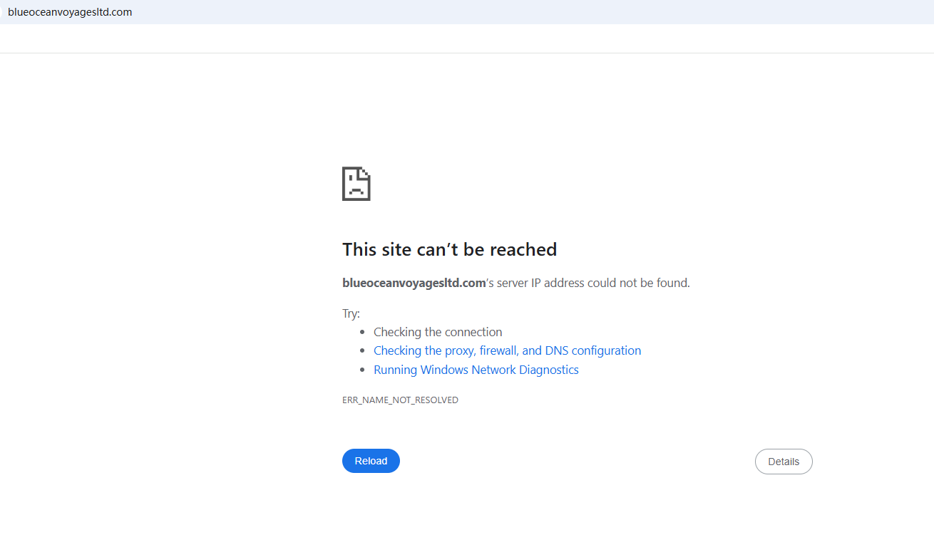 BrokersView found that the domain "https://blueoceanvoyagesltd.com/" is currently inaccessible. This is widely regarded as a significant red flag, as the suspension of a broker's website often points to underlying regulatory or operational issues.