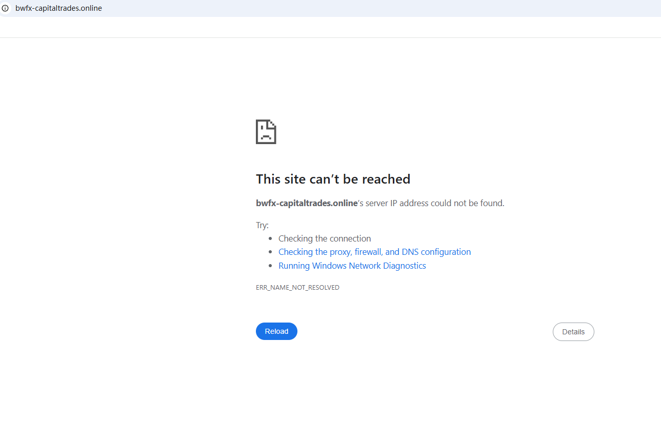 BrokersView found that the domain "https://bwfx-capitaltrades.online/" is currently inaccessible. This is widely regarded as a significant red flag, as the suspension of a broker's website often points to underlying regulatory or operational issues.