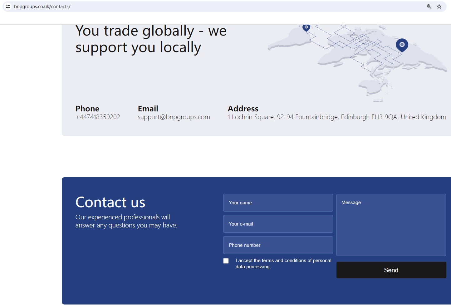 According to its website, it is located in the UK. Upon investigation, we found that the United Kingdom Financial Conduct Authority (UK FCA) issued a warning that BNP Groups was providing financial services or products in the UK without authorisation.