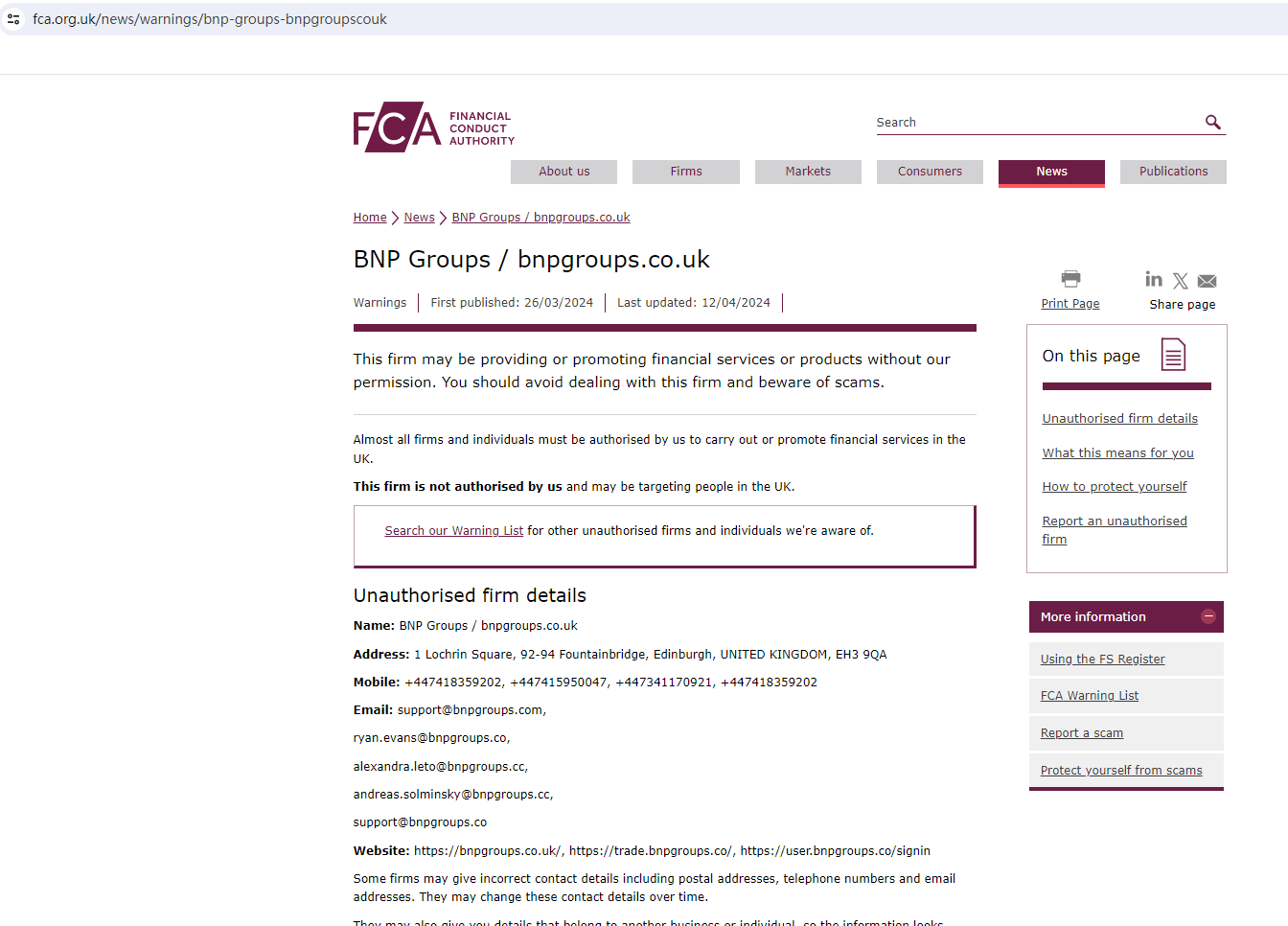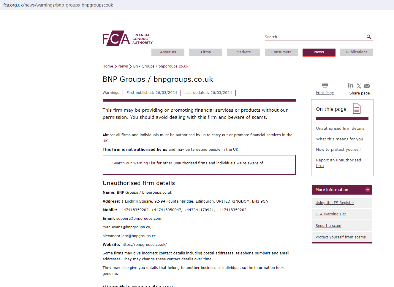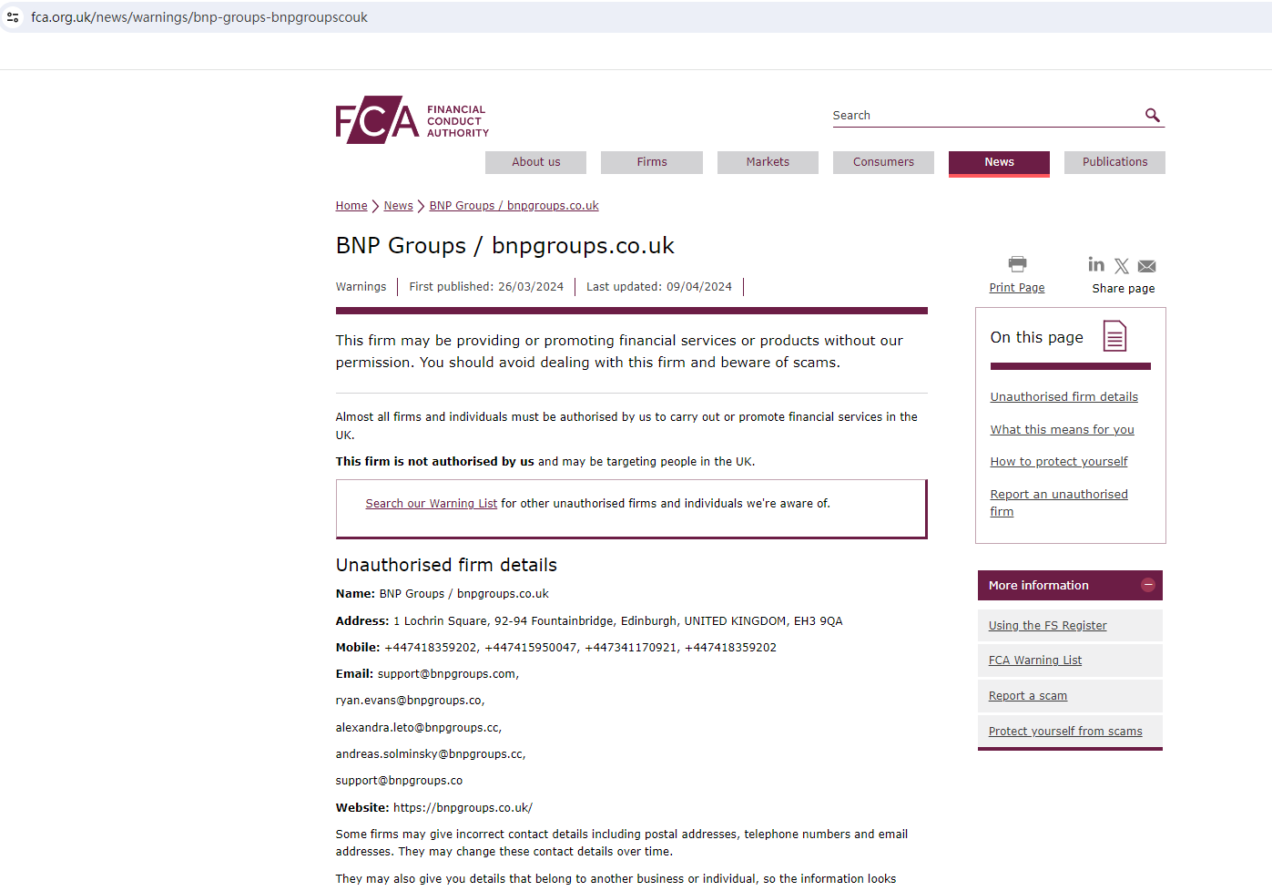 On 26 March 2024, the United Kingdom Financial Conduct Authority (UK FCA) issued a warning that BNP Groups was providing financial services or products in the UK without authorisation. You may visit: https://www.fca.org.uk/news/warnings/bnp-groups-bnpgroupscouk