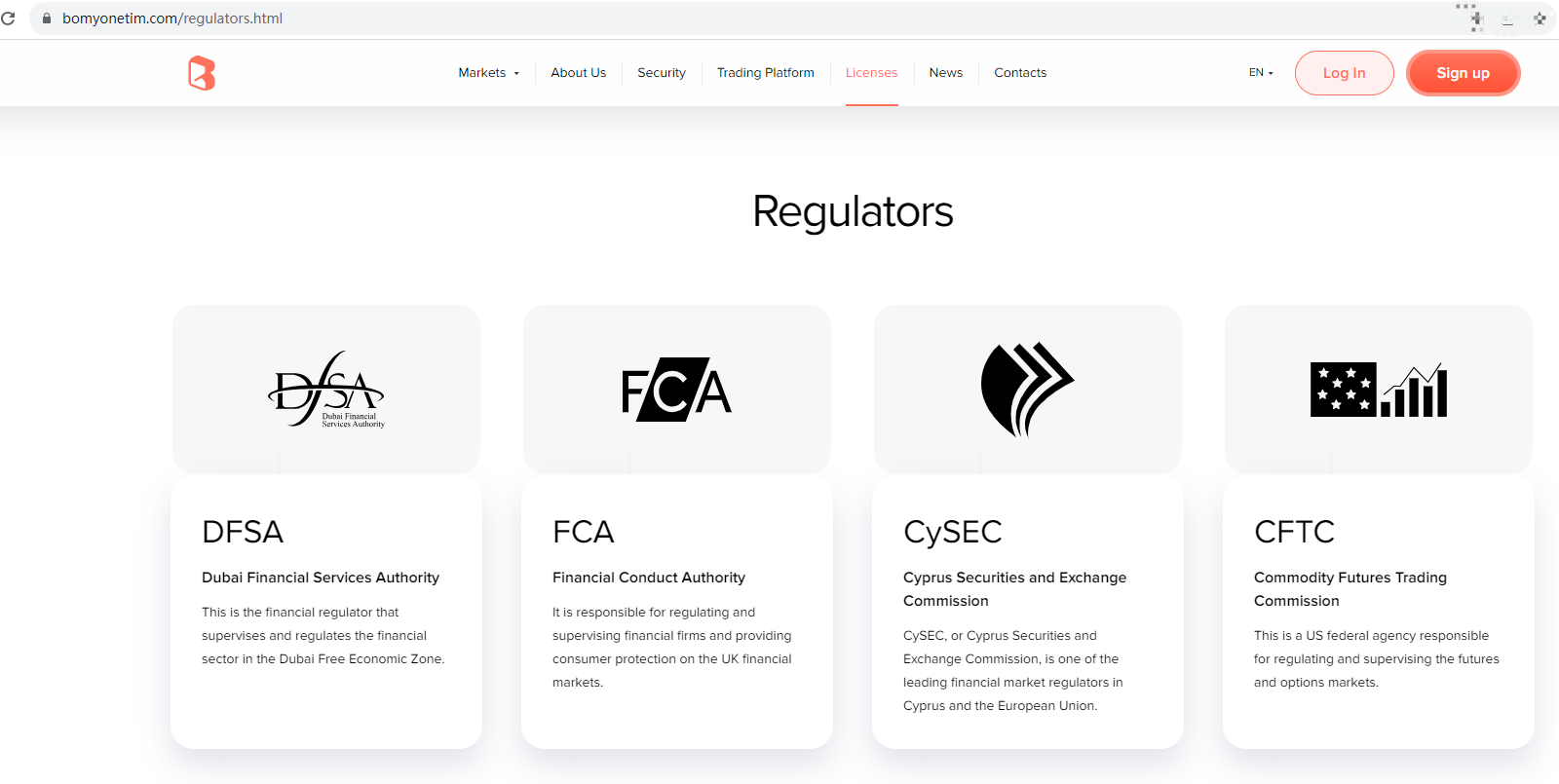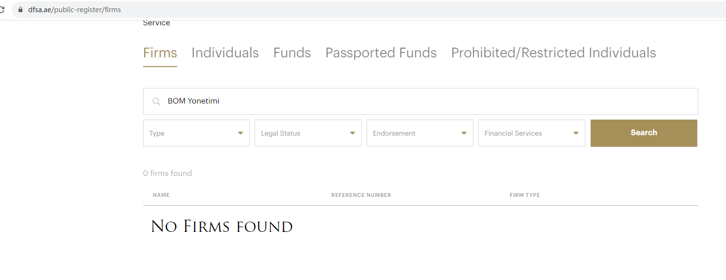 BOM Yonetimi claims to be regulated by Dubai Financial Services Authority (DFSA), Financial Conduct Authority (FCA), Cyprus Securities and Exchange Commission (CySEC) and Commodity Futures Trading Commission (CFTC), but we found no matching or authorised results on these regulators. It is a red flag.