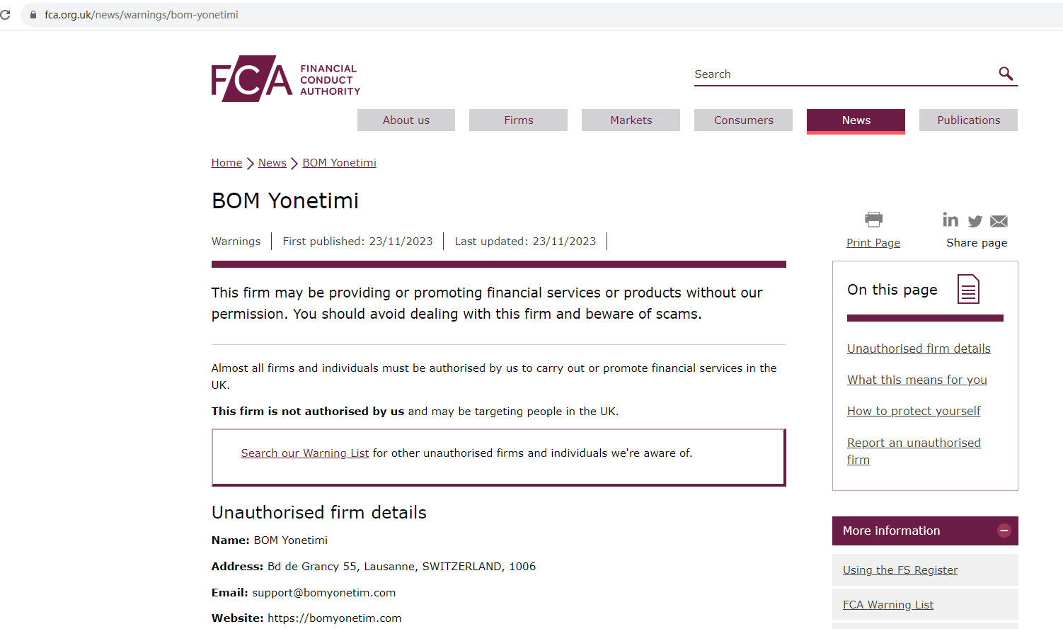 On 23 November 2023, the United Kingdom Financial Conduct Authority (UK FCA) issued a warning that BOM Yonetimi was providing financial services or products in the UK without authorisation. You may visit: https://www.fca.org.uk/news/warnings/bom-yonetimi