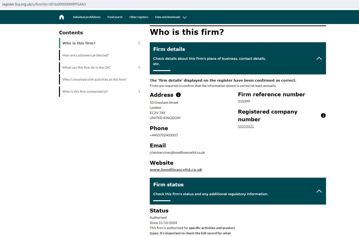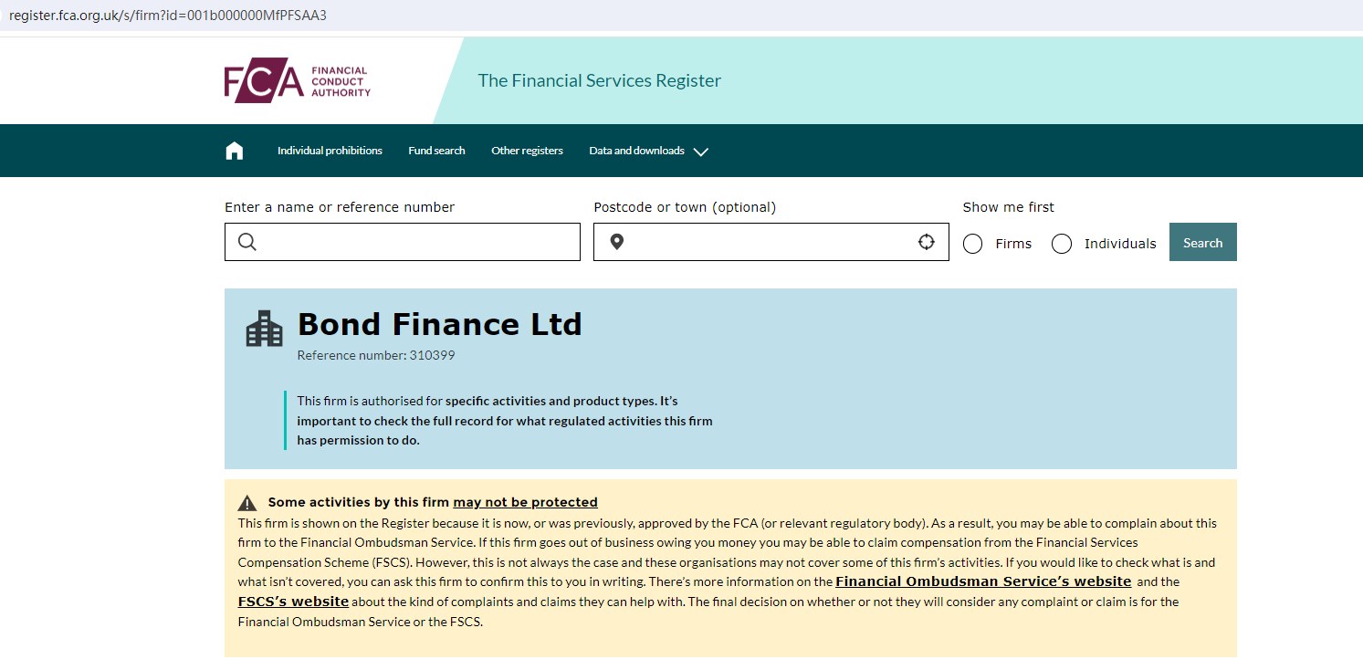 However, we found that Bond Finance Ltd (www.bondfinanceltd.co.uk) is authorized by the United Kingdom Financial Conduct Authority (FCA), its business scope is mortgages and home finance, excluding financial derivatives. So Bond LTD (bondltdfinance.com) is not regulated by the FCA.