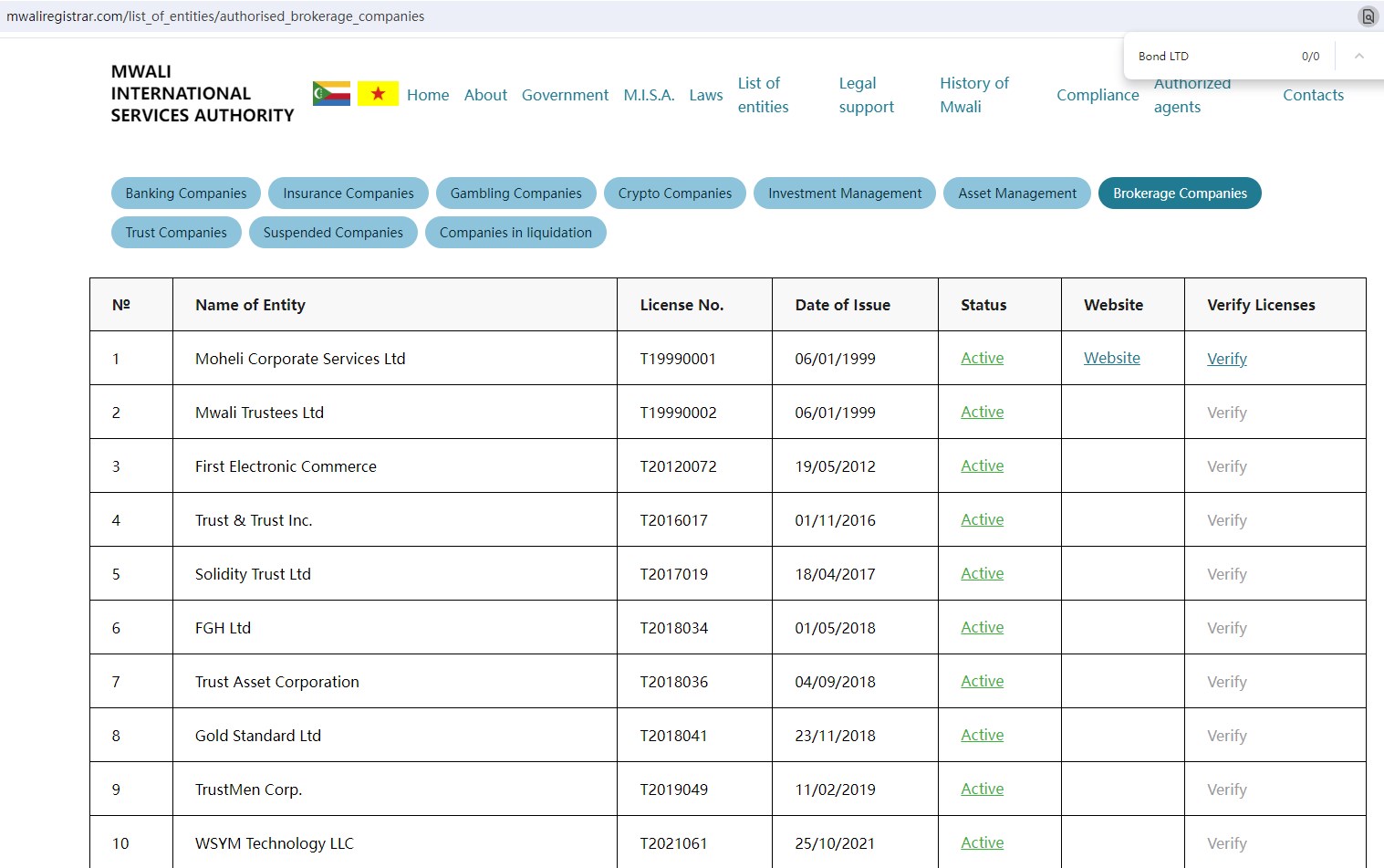 Upon investigation, there is no registration of Bond LTD in the lists of Brokerage and Crypto Companies in the MISA of Comoros.