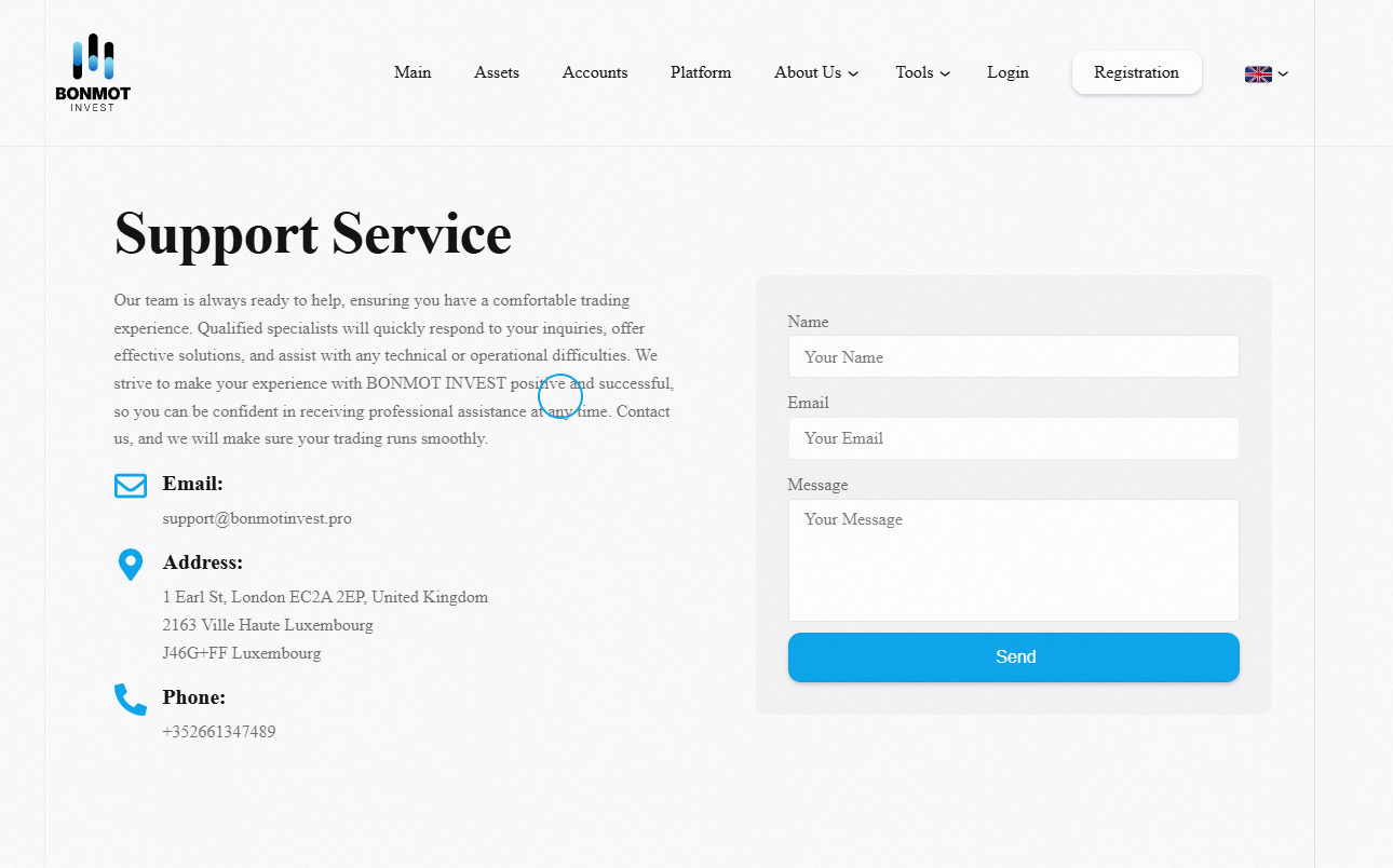 BONMOT INVEST does not display any licenses related to forex or financial services and only provides addresses in the United Kingdom and Luxembourg, without clearly stating its official registered company name.