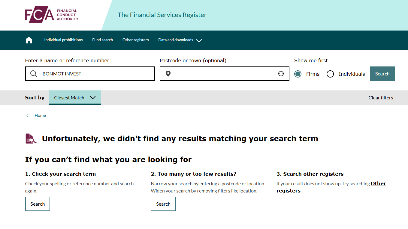 We conducted thorough searches with the UK’s Financial Conduct Authority (FCA) and Luxembourg’s Commission de Surveillance du Secteur Financier (CSSF), and found no record of BONMOT INVEST in either registry.
