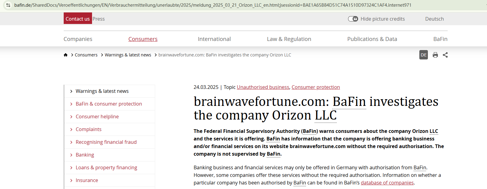 On March 24, 2025, the Federal Financial Supervisory Authority (BaFin) issued a warning against Brain Wave Fortune for the lack of the required authorization. https://www.bafin.de/SharedDocs/Veroeffentlichungen/EN/Verbrauchermitteilung/unerlaubte/2025/meldung_2025_03_21_Orizon_LLC_en.html;jsessionid=BAE1A65B84D51C74A1510D97324C1AF4.internet971