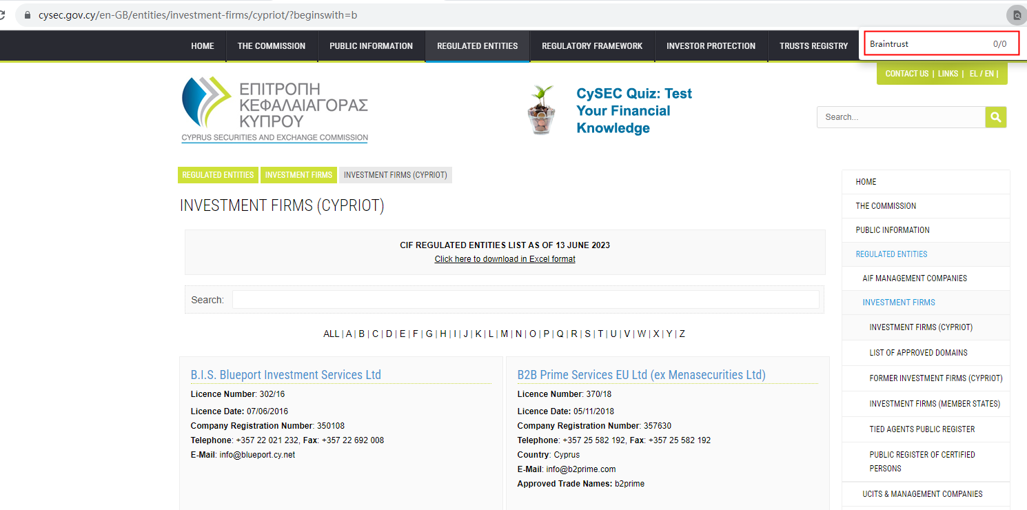 But there is no searching results on the Cyprus Securities and Exchange Commission (CySEC) and FSA of Saint Vincent and the Grenadines by Braintrust/23787, and the registration number 23627 is linked to another company Land Prime LTD, which has nothing to do with Braintrustfx.