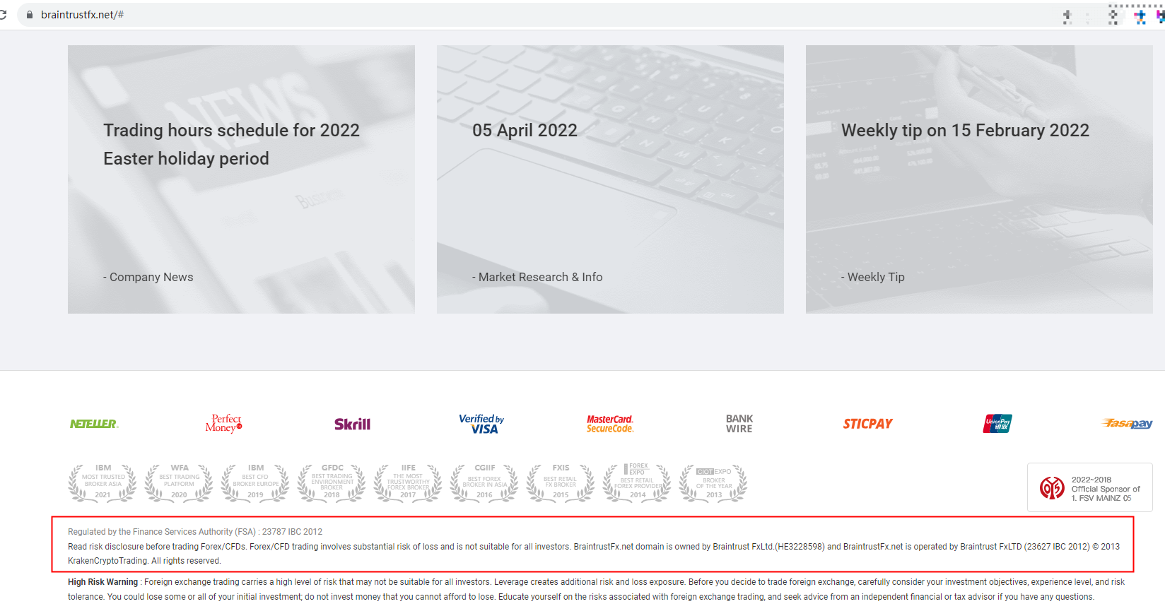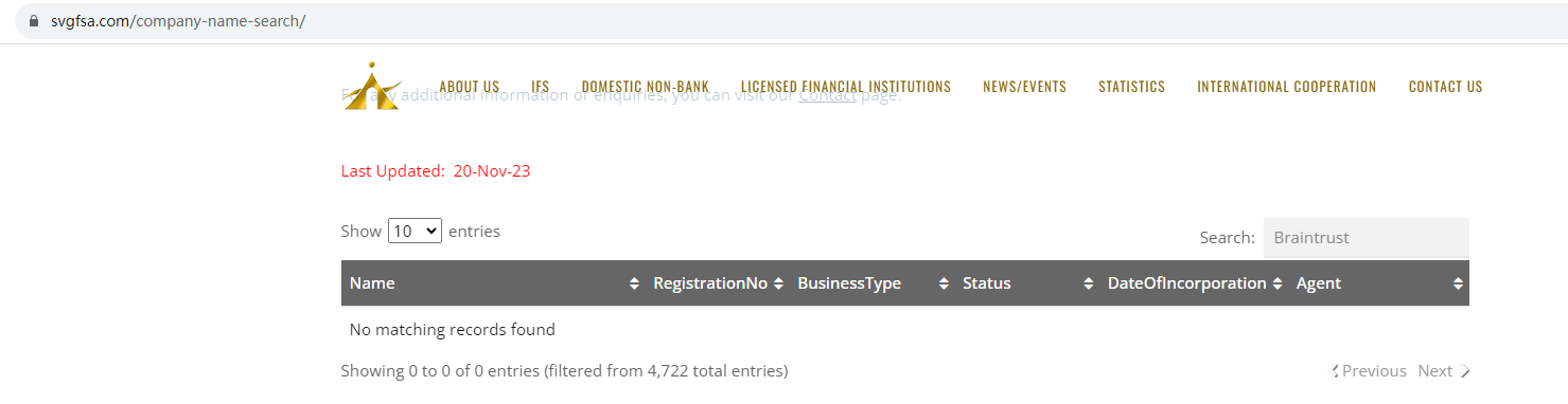 Braintrustfx claims to be registered in Cyprus and Financial Services Authority (FSA) of Saint Vincent and the Grenadines.