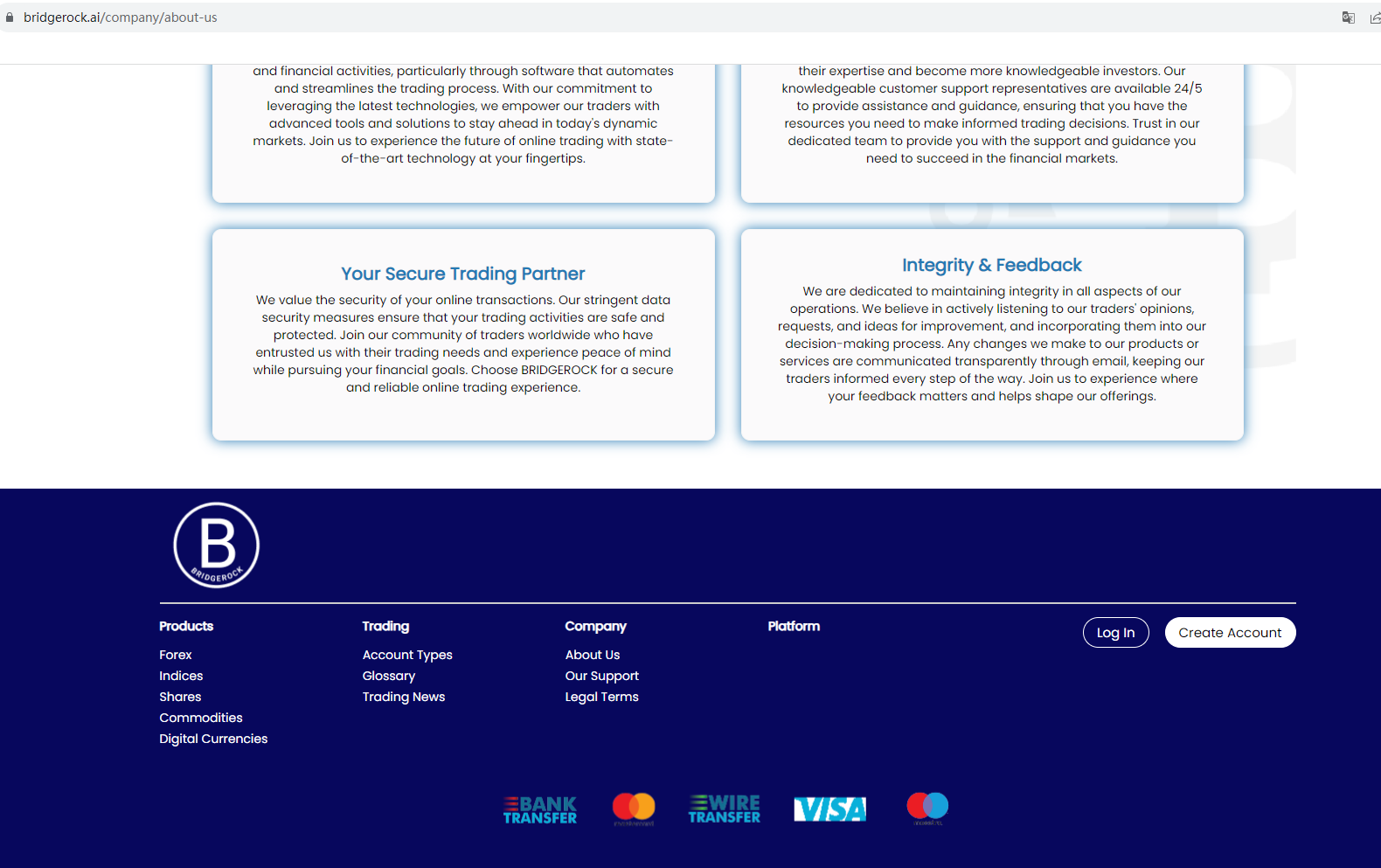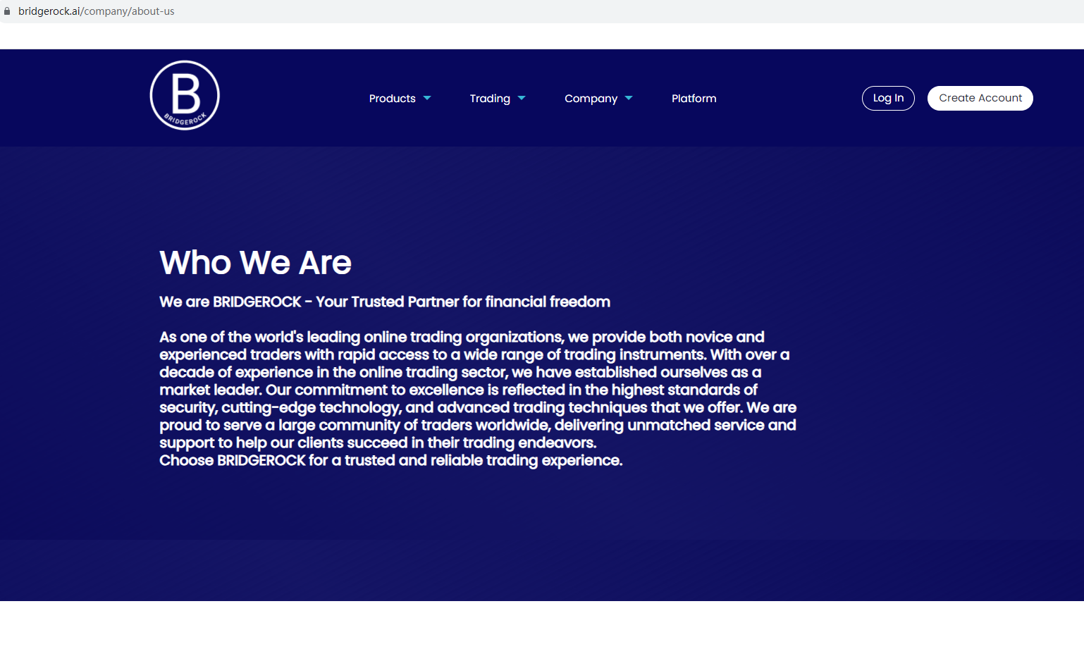 BRIDGEROCK claims to be a reliable company without presenting any information about its regulation or contact. The lack of such important information may be a distinct signal of an unlicensed broker, as regulated companies always present their accreditations and licenses in a prominent position. It is a red flag.