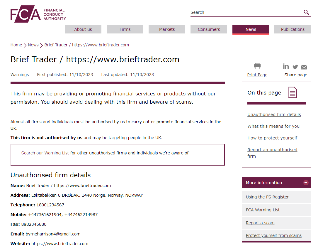 On 11 October 2023, the United Kingdom Financial Conduct Authority (UK FCA) issued a warning that Brief Trader was providing financial services or products in the UK without authorisation. You may visit: https://www.fca.org.uk/news/warnings/brief-trader-https-wwwbrieftradercom