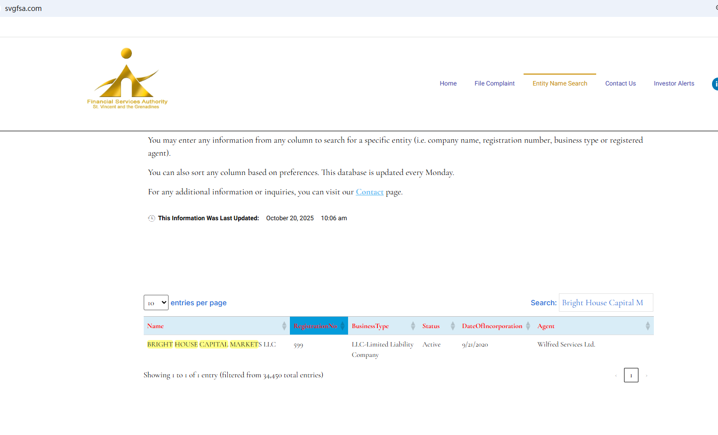 Bright House Capital Market claims to be registered with the St. Vincent and the Grenadines Financial Services Authority (SVG FSA). While this registration remains valid, the SVG FSA does not have the authority to regulate forex and does not constitute a valid forex license. Furthermore, Bright House Capital Market does not appear to be authorized by any reputable financial regulator, raising serious concerns about potential fraud.