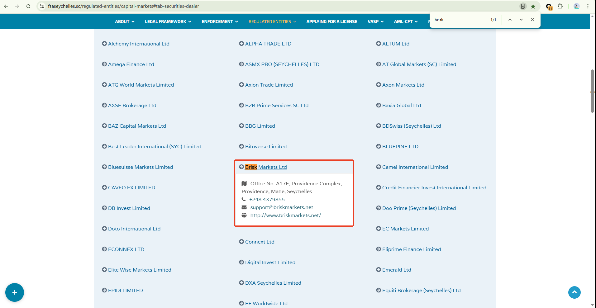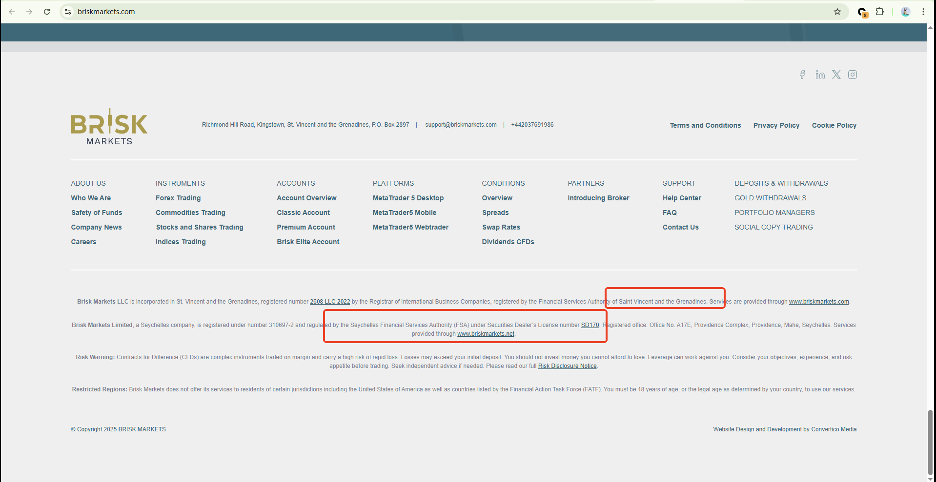 Brisk Markets claims registration with the Saint Vincent and the Grenadines FSA, but this only confirms its status as an International Business Company (IBC), not a valid financial license. The company also claims to operate in Seychelles under the Seychelles FSA with license number SD170; however, the official registry lists "briskmarkets.net" as the authorized domain, differing from its current website, raising concerns about legitimacy. Although the services are claimed to be provided through the registered domain, the discrepancy warrants scrutiny. Brisk Markets is suspected of being a scam.